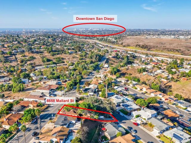 RARE, 2 on 1 (2 homes on 1 parcel) with access from 2 streets (Mallard St and Tiffin Ave) on a large view lot! The main house 3BD/2BA w/optional bedroom and granny flat/guest house 1BD/1BA nestled above 2-car garage with long driveway accessible from Tiffin Ave. Great investment property or primary residence w/ residual rental income, projected combined rental income of $4000/mo or more. Enjoy city view of Downtown San Diego, just 5 miles away. Close to all; shops, restaurants, schools and freeway.