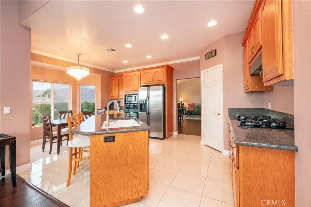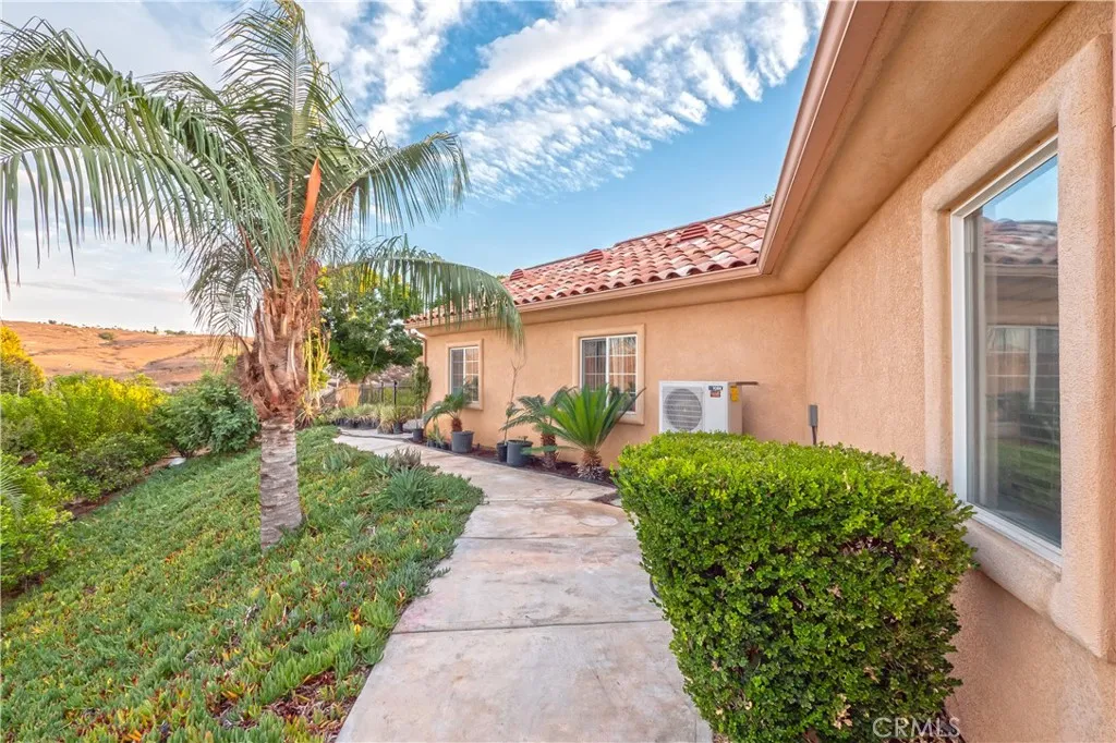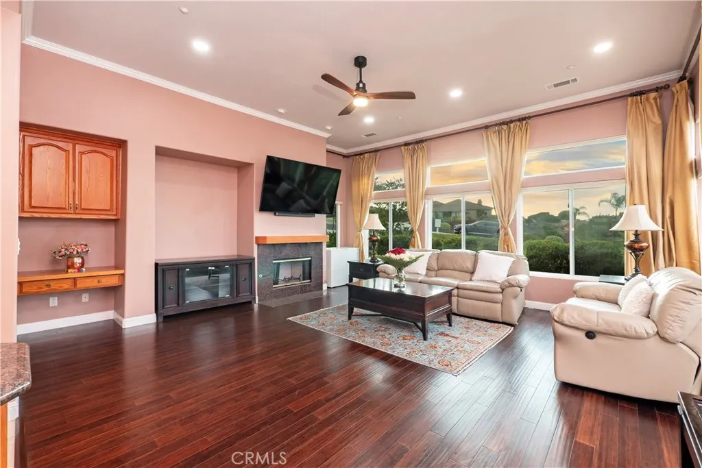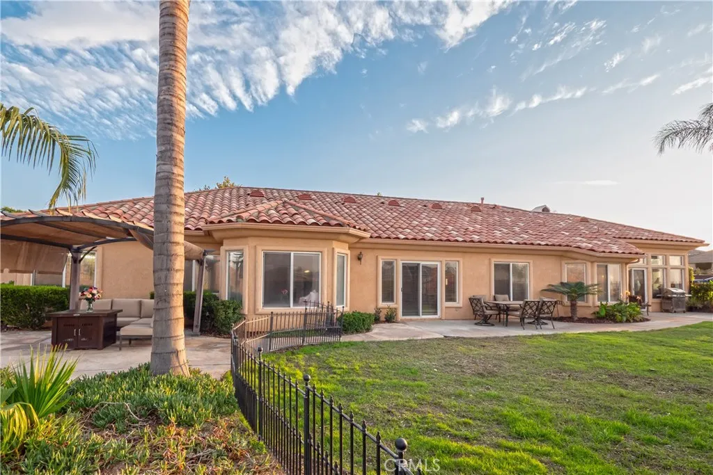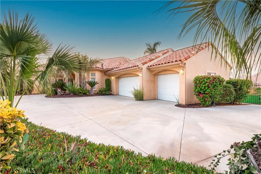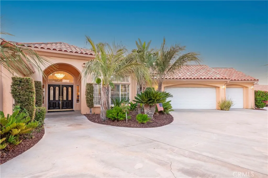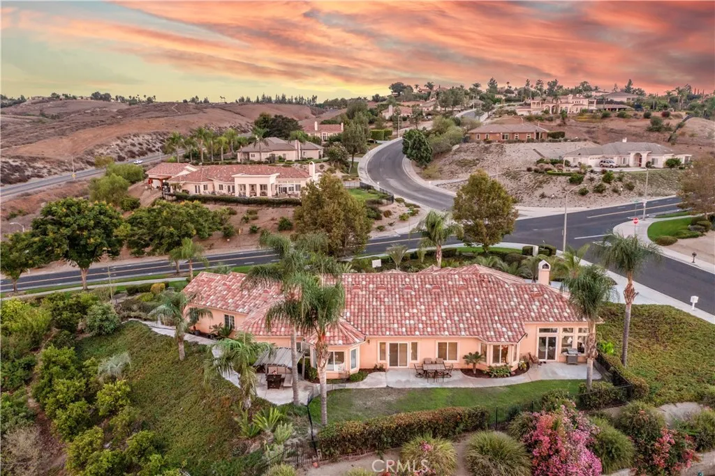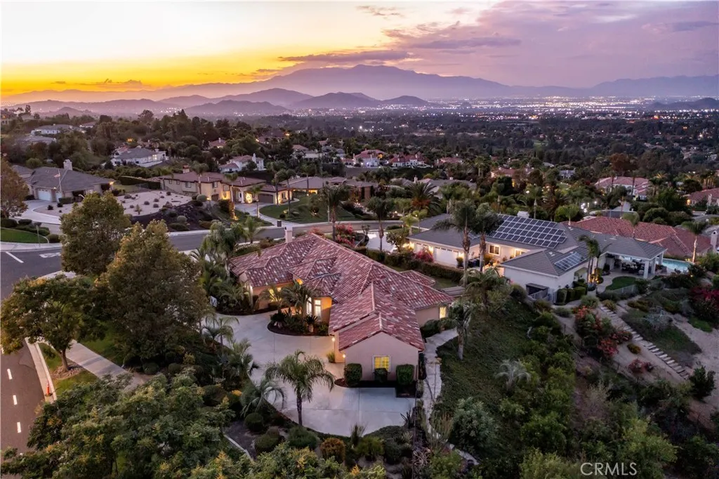 This stunning Canyon Crest Estates single-story home offers a perfect blend of comfort and elegance along with its breathtaking mountain and city light views that will captivate you from the moment you arrive. Step inside to find a beautifully designed home with vaulted ceilings, crown molding, porcelain tile and engineered hardwood floors that enhance the spacious living area. The large foyer and living/dining room offer beautiful backyard views and lots of natural light make the space ideal for entertaining guests. The open kitchen flows effortlessly into the family room with its fireplace and city light views; a perfect spot for casual gatherings or quiet evenings. With four thoughtfully designed bedrooms, including a primary suite that has a retreat and an ensuite with dual sinks, vanity area, jetted soaking tub and large shower. For those who work from home or need dedicated spaces for crafts or fitness, the two offices provide versatility and convenience. Embrace the outdoors with patios overlooking stunning views, waterwise landscape and a grove of citrus and avocado trees. Located just a stone's throw from Canyon Crest Country Club, you'll have access to premier golf, dining, and social opportunities. The convenience of a three-car garage with built-ins adds to the functionality of this luxurious property. Dont miss the opportunity to make this beautiful home your own.