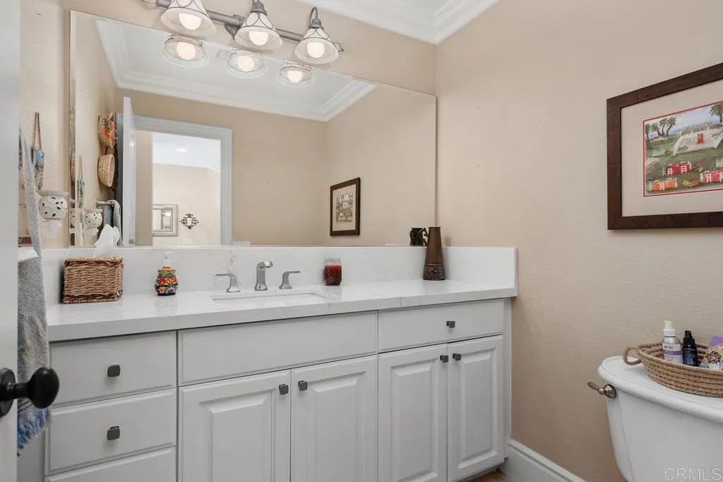 Nestled in the serene and exclusive community of Carlsbad, this stunning residence offers 3,881 square feet of beautifully designed living space. Featuring 5 spacious bedrooms and 4.5 luxurious bathrooms including a convenient downstairs bedroom and bath perfect for guests or extended family this home blends comfort and elegance at every turn. Thoughtfully appointed with modern upgrades, the property boasts a tankless water heater, a whole-home water purification system, owned solar panels, and a whole-house fan to keep energy costs low and comfort levels high. With its open floor plan and premium features, this home truly defines Southern California living at its finest. Step inside to discover newly installed LVP flooring, complemented by plush new carpets in the bedrooms for added comfort. The heart of the home, the kitchen, has been stylishly updated with sleek new counters, a chic backsplash, and modern sinks and fixtures, making it a culinary enthusiast's paradise. Top-of-the-line Wolf appliances and a Sub-Zero refrigerator enhance the kitchen, ensuring you have everything you need at your fingertips. Upstairs, enjoy the tranquility brought by new windows that allow natural light to pour in, creating a warm and inviting ambiance. Four of the bedrooms have en-suite bathrooms that have been thoughtfully updated, ensuring a spa-like experience right at home. The property also features beautiful la Cantina doors that take you out to a substantial outdoor space, ideal for hosting summer barbeques or simply enjoying California's beautiful weather. Located in the acclaimed