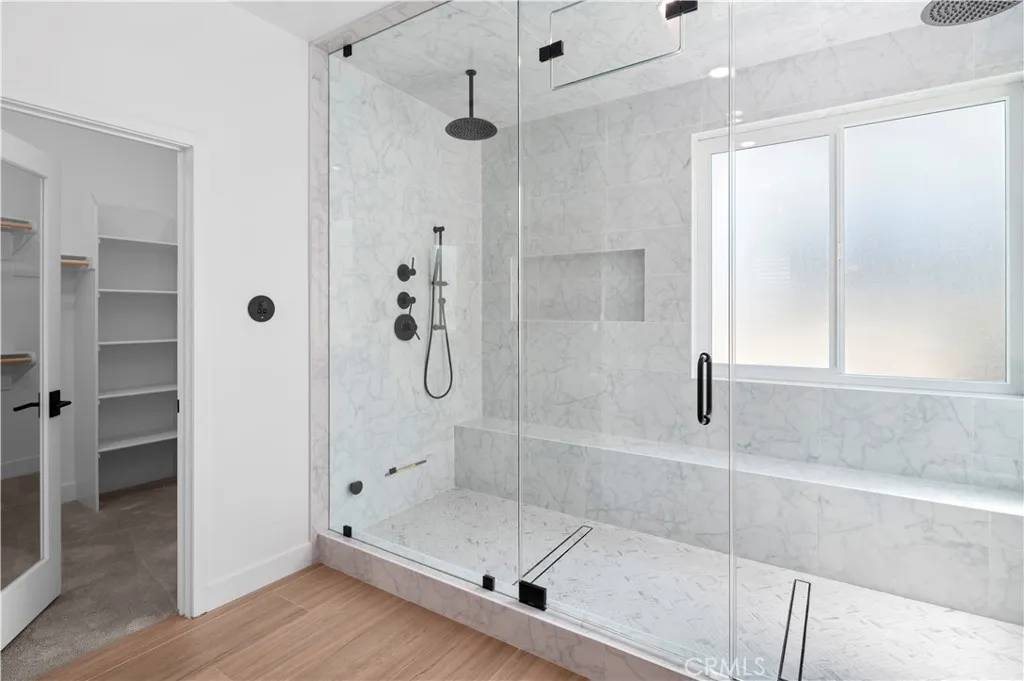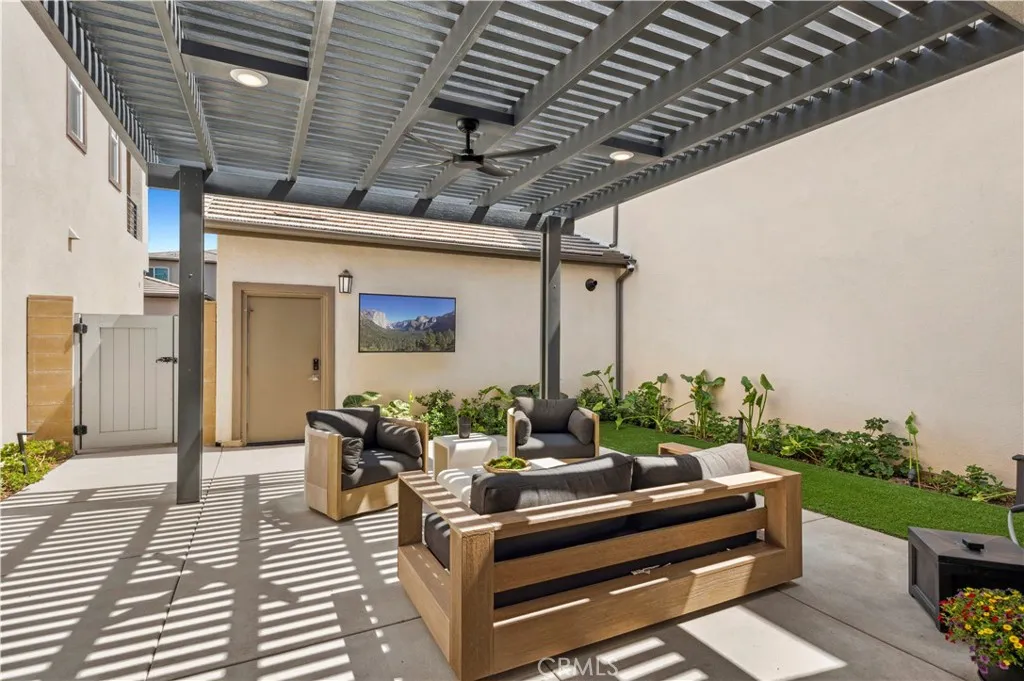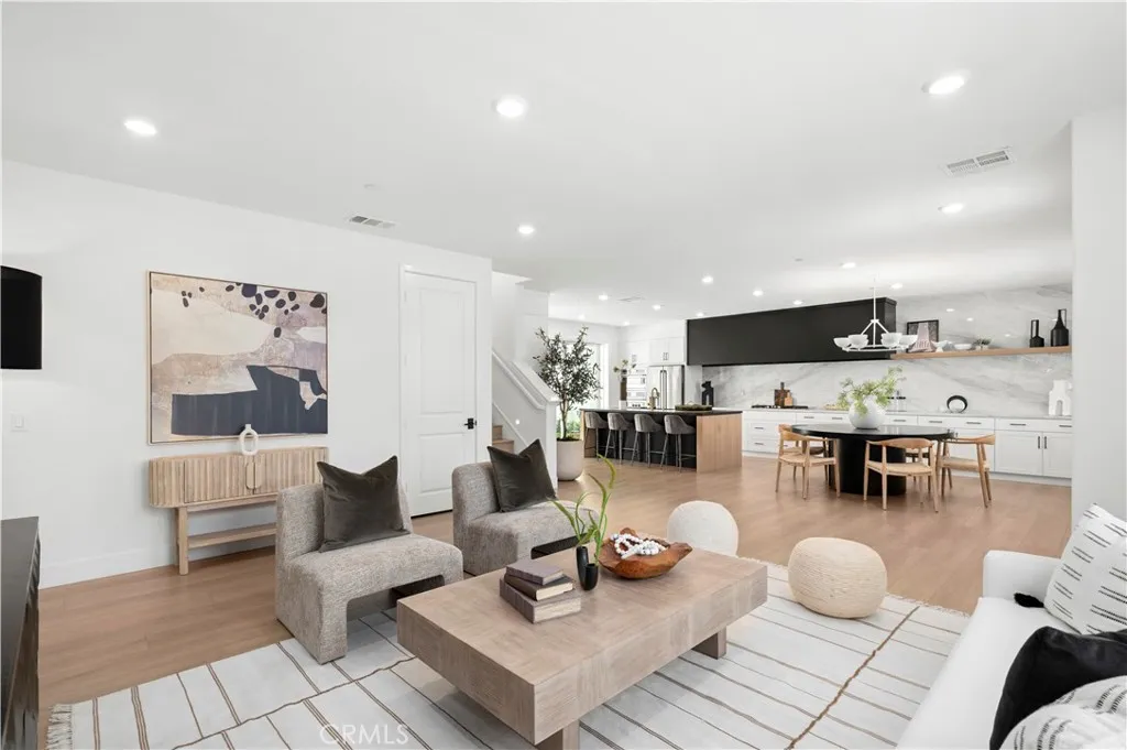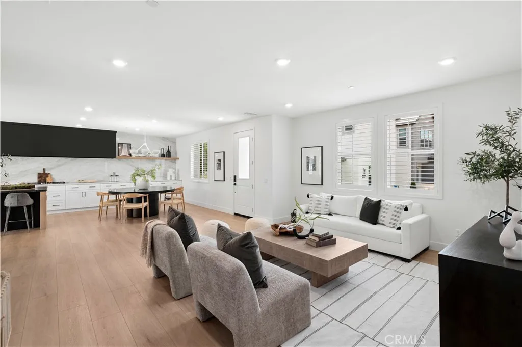 Blending style, function, and comfort, this Residence 2 Modern Farmhouse floor plan is ideal for both daily family living and entertaining. 220 Tank, part of the Amber at Solis community, is a stunning 4-bedroom, 3-bathroom, two story detached condo in the heart of the Great Park community offers 2,418 sq. ft. of thoughtfully designed living space. Step through the covered front porch into a bright and inviting interior. A dedicated dining room, anchored by a custom West Elm Florent 6-Light chandelier, sets the stage for gatherings. The chef-inspired kitchen boasts an oversized island with upgraded Carbo brushed quartz countertops by LX Hausys, light oak built-in accent siding, LG Caf stainless steel appliances, a decorative custom hood cover, floating shelves, and abundant ceiling-height cabinetry. A triple-panel sliding glass door seamlessly connects the kitchen to the patio, while the open-concept living room encourages interaction and community. The first floor also features a versatile downstairs bedroom and a full bathroom with a remodeled step-in showerperfect for guests, a home office, or playroom. Upstairs, the primary suite is a true retreat with a customized spa-like ensuite. The oversized enclosed shower includes a Mr. Steam shower system, built-in bench, and multiple shower heads, while dual sinks, updated counter tops and a spacious walk-in closet completes the suite. Two additional bedrooms, an upgraded shared bathroom, and a customized laundry room round out the upper level. The backyard is designed for easy indoor-outdoor living with a cement patio, custom