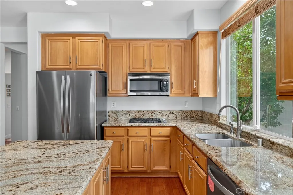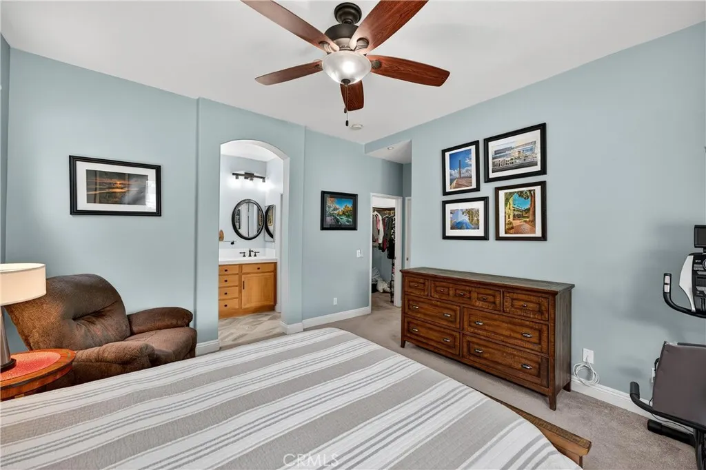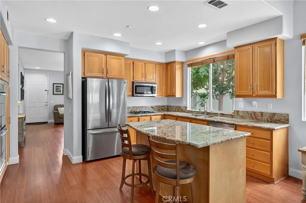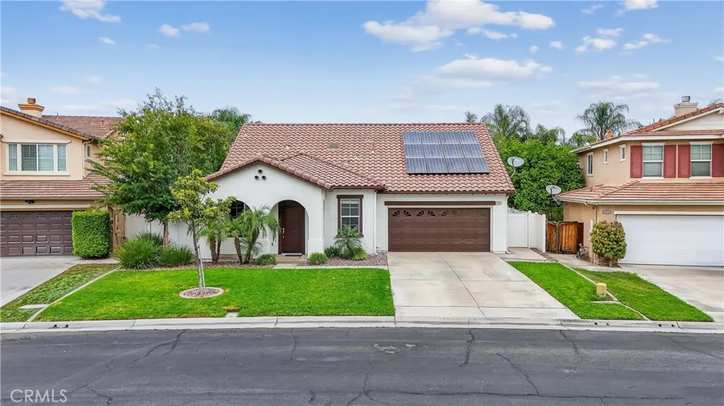 Welcome to this beautifully maintained home tucked inside a private gated community. Fresh interior paint sets a welcoming tone, leading you into open living spaces, with tons of natural light. The formal dining room and living room is designed for entertaining. Featuring a convenient downstairs primary suite, perfect for guests or multi-generational living. The kitchen is designed for both fun cooking and effortless entertaining, with granite countertops, a stainless steel sink, double ovens, and a newer island that invites everyone to gather around. Pull-out cabinets make storage simple, while the included refrigerator and newer dishwasher add convenience. From here, the kitchen flows seamlessly into the family room, where family and friends can gather. Head upstairs and youll discover a spacious loft, a flexible retreat ready to become a media room, office, or play space. Upstairs also features the unique second primary suite. Step outside and enjoy a backyard that feels like a private oasis. A full-length Alumawood patio cover with ceiling fans offers year-round shade, while mature fruit trees, apricot, apple, orange, and lemon, line the yard, bringing both beauty and bounty. Vinyl fencing frames the space, while low-maintenance landscaping and recently painted exterior ensure lasting curb appeal. Practical updates continue with a newer garage door opener, built-in shelving, and included cabinets, providing plenty of storage. An indoor laundry room makes daily life easier, and an upgraded HVAC condenser brings peace of mind for years to come. This is more than a house,