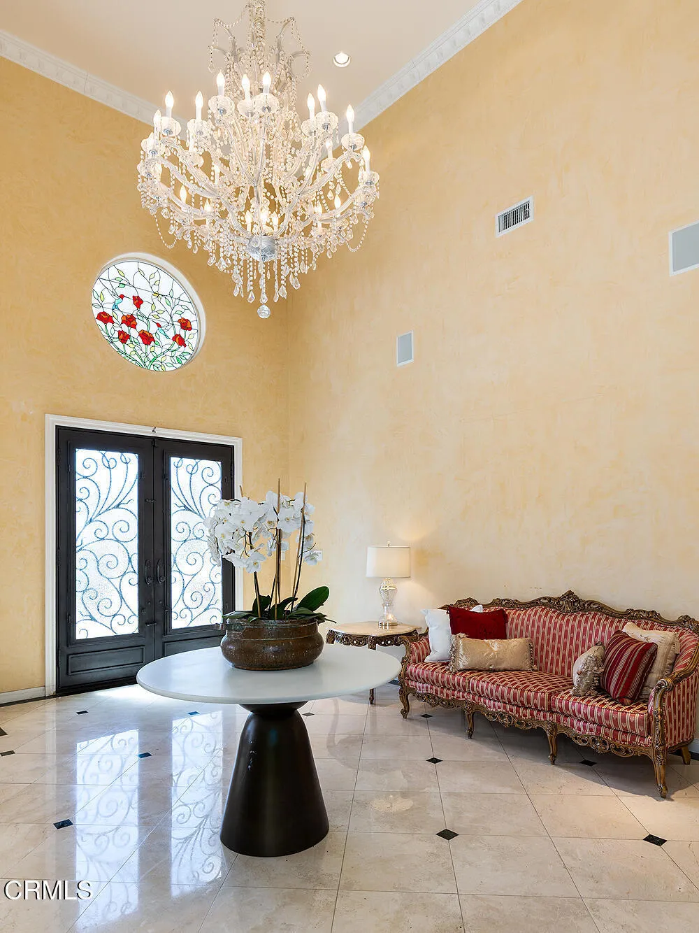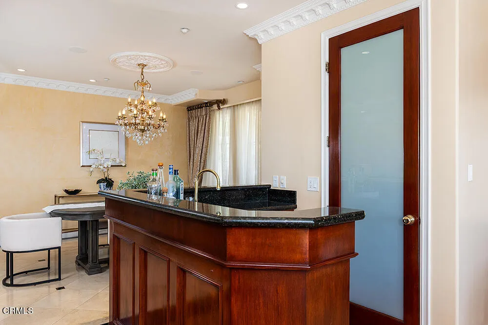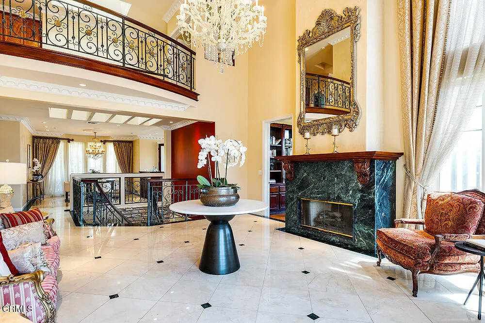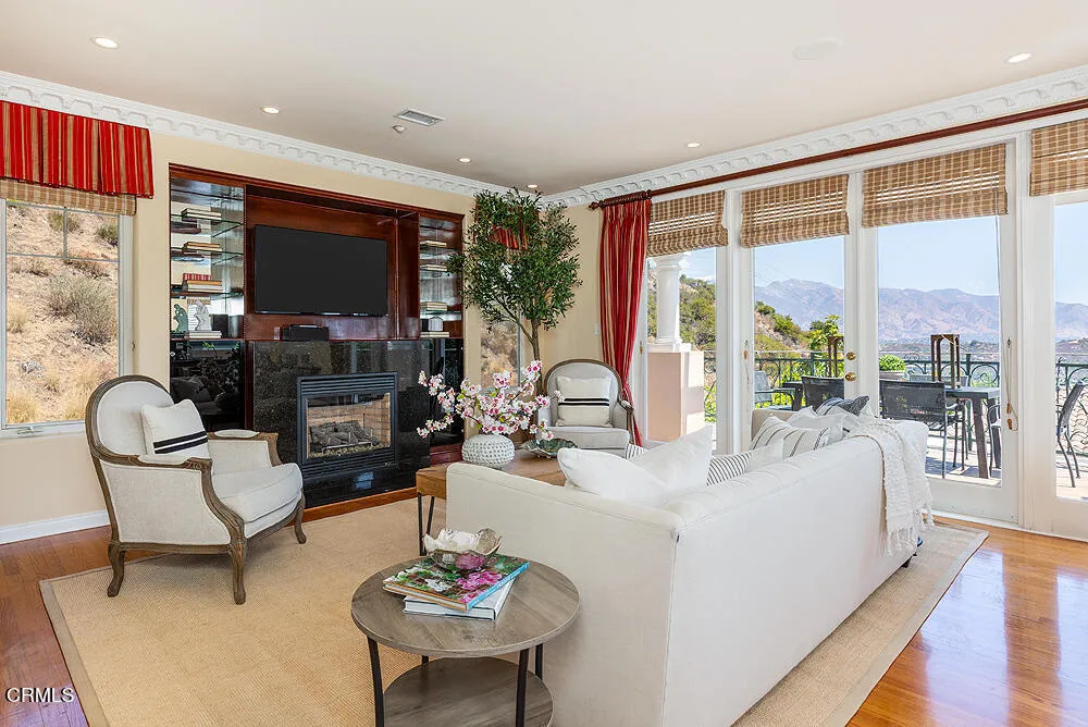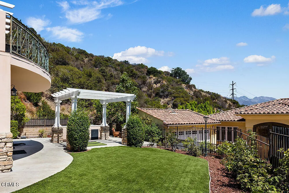 Perched high in the hills above Glendale, this custom-built 1998 residence showcases sweeping views of the lower basin and sparkling city lights. Designed with scale and sophistication, the home offers 5 bedrooms, 5 bathrooms, and two kitchens, along with an array of refined living and entertaining spaces.Spanning three levels, the floor plan blends intimacy with grandeur. Highlights include a wood-paneled library with wall-to-wall bookcases and dramatic views, a formal dining room, and a welcoming family room with a broad balcony overlooking the city. The living room is accented with Venetian plaster walls and an artist-designed stained-glass depiction of Springtime above the entry door, creating a striking first impression.At the heart of the home, the main kitchen features an oversized granite island, custom-designed cabinetry, and state-of-the-art appliances, including a Sub-Zero refrigerator/freezer, Wolf range/oven, and Bosch dishwasher. An additional kitchen offers versatility for entertaining or multigenerational living.The oversized primary suite enjoys its own view balcony and a luxurious bath with separate tub and shower. On the lower floor, an ensuite bedroom and versatile entertainment room open seamlessly to the gardens, offering an ideal indoor-outdoor flow.Outdoors, the grounds are designed for year-round enjoyment with lush landscaping, a covered patio, built-in BBQ, and tranquil gardens. A newly paved driveway enhances the home's curb appeal, while a solar power system provides modern efficiency.Inside, the extensive use of marble, granite, wood, and glass