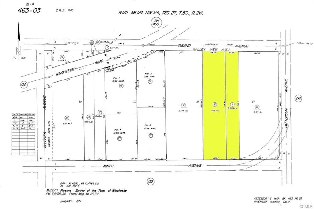 Introducing a vacant lot located at 9th Street, Winchester, CA 92596, identified by APN 463-030-011, spanning 0.96 acres. Situated in a serene and evolving area of Winchesteran 8-square-mile community set amid picturesque Inland Empire hills approximately 8 miles southwest of Hemet, these lots benefit from water and power available at the street, offering a rare blank canvas with key infrastructure in place. Located within reach of the 215 Freeway and nearby amenities, they position future owners for both convenience and country charm. Dont miss this opportunity to claim a substantial portion of Winchesters tranquil landscape. Seller also has for sale the property next door APN 463-030-010 ****No soils reports, surveys, etc., have been done. Buyer and buyer's agent to verify all information with the city or county for allowable uses and requirements and rely on their own investigations. **Buyer responsible for checking zoning, utilities, permits and exact property boundaries. ****
