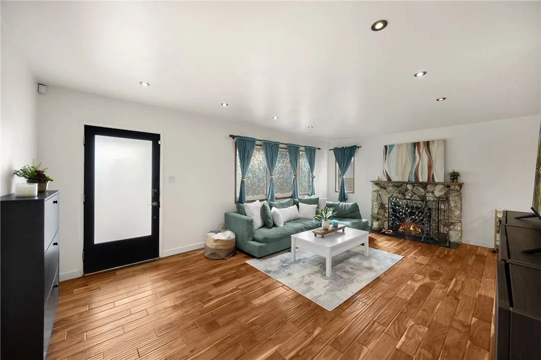 Charming single-story residence in the heart of Reseda offering a perfect blend of comfort, style, and functionality. This well-maintained home features 3 spacious bedrooms with ample closet space and one updated bathroom, thoughtfully designed with a walk-in shower, pedestal sink, and bold black fixtures. The inviting living room showcases a stone fireplace, recessed lighting, and large windows, creating a bright and airy atmosphere that flows into the dining area. French doors in the dining room open to a private backyard, perfect for entertaining. The updated galley-style kitchen boasts granite countertops, sleek black cabinetry, stainless steel appliances, and a stylish tile backsplash. A convenient laundry area provides direct access to both the kitchen and the backyard. The lush backyard is designed for both relaxation and gatherings. A spacious covered patio with a ceiling fan serves as an outdoor living room, ideal for morning coffee or year-round entertaining. The yard offers open green space, mature trees, and a charming pergola dining area, beautifully accented with string lighting for cozy evenings. In addition to its inviting outdoor amenities, this property offers ample functionality with a detached garage and an extra gated parking space accessible from the alley. This outdoor haven strikes the perfect balance of comfort, privacy, and practicality ideal for first-time buyers, growing families, or anyone looking for a move-in-ready property filled with character and charm! Note: the photos of the front yard have been edited to include virtual grass. The backy