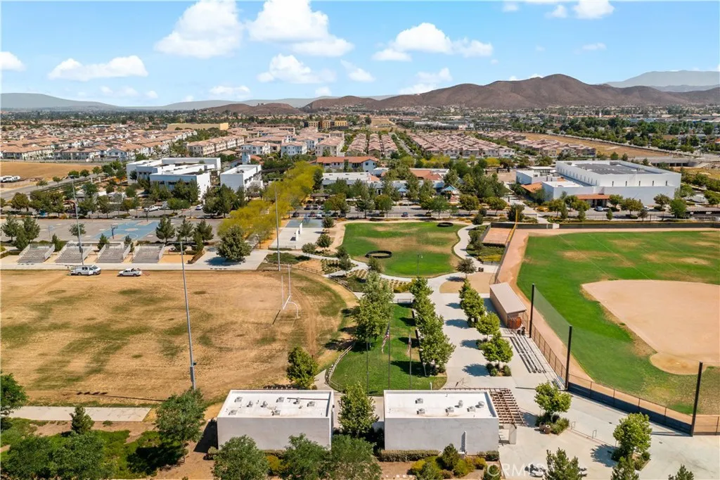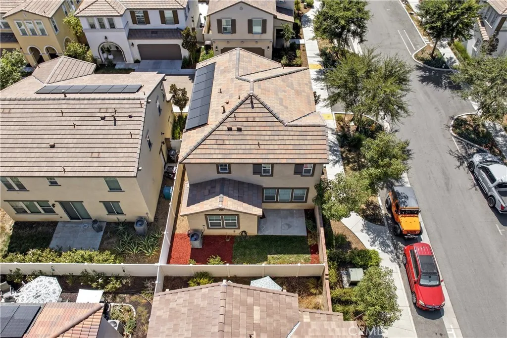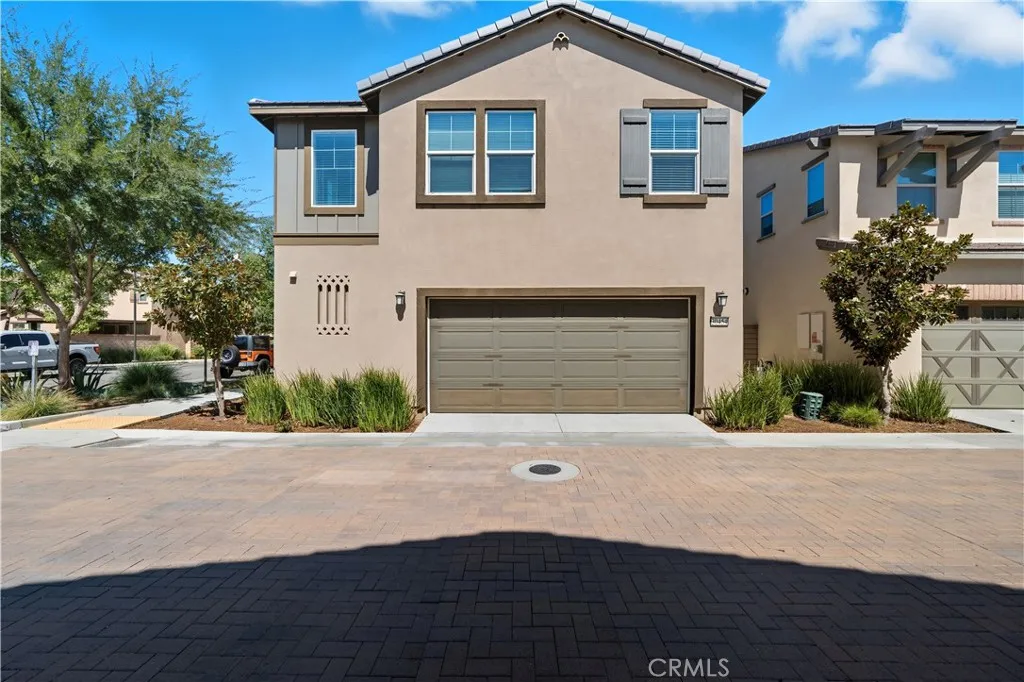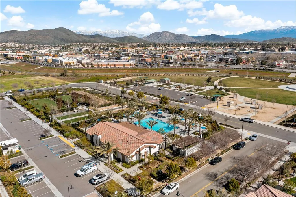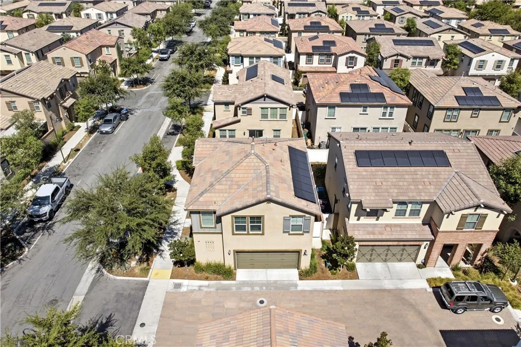 Welcome to The Village at Menifee Town Center! Offering "PAID-FOR-SOLAR" & EV CHARGING STATION! Discover modern comfort in this beautifully newer-build home designed with functionality in mind. Nestled in the heart of Menifee, This darling 3-bedroom, 2.25-bathroom home offers an ideal location within walking distance of shopping, dining, and with easy freeway access. Step into a low-maintenance lifestyle with a well designed backyard featuring a concrete patio, perfect for relaxing or entertaining. Inside, the home is equipped with smart features compatible with Alexa and the Ring app. The interior boasts laminate flooring throughout the downstairs, while the open-concept kitchen and family room create an inviting space to gather and unwind. The kitchen features a large island with bar seating, granite countertops, and sleek dark cabinetry. Upstairs, youll find the conveniently located laundry room and all three bedrooms, including the spacious primary suite featuring a walk-in closet, separate water closet, makeup vanity, luxurious walk in shower and dual vanity in the en-suite bathroom. The secondary bathroom also offers dual sinks and a privacy door for added convenience. A stylish downstairs powder room with a pedestal sink is perfect for guests. The garage offers overhead storage racks, 220 electrical and a tankless water heater. But its not just the home thats impressiveThe Village community offers exceptional amenities, including a pool, spa, clubhouse, fire pit, BBQ area, outdoor kitchen, picnic spots, dog park, 5-acre park, and scenic walking trails. This home has
