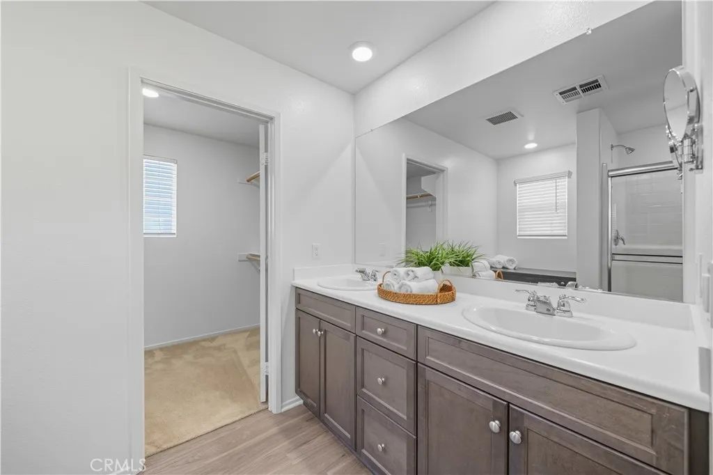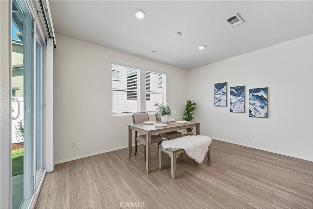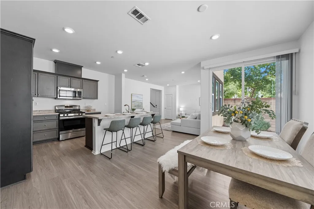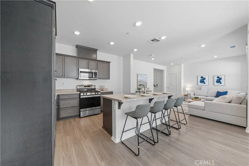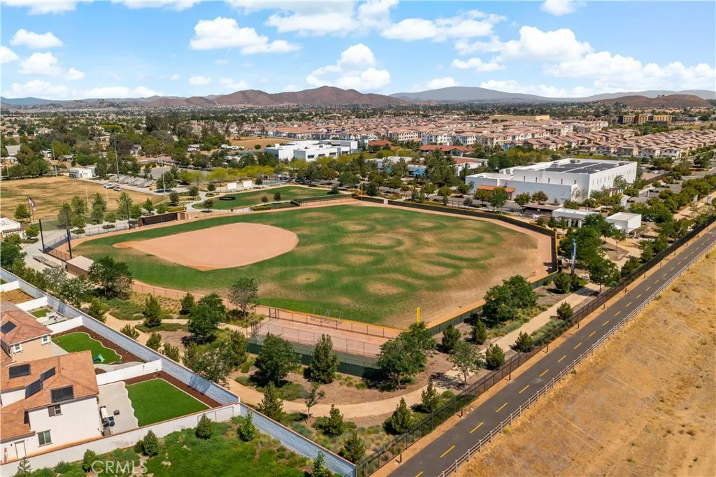 Welcome to The Village at Menifee Town Center! Offering "PAID-FOR-SOLAR" & EV CHARGING STATION! Discover modern comfort in this beautifully newer-build home designed with functionality in mind. Nestled in the heart of Menifee, This darling 3-bedroom, 2.25-bathroom home offers an ideal location within walking distance of shopping, dining, and with easy freeway access. Step into a low-maintenance lifestyle with a well designed backyard featuring a concrete patio, perfect for relaxing or entertaining. Inside, the home is equipped with smart features compatible with Alexa and the Ring app. The interior boasts laminate flooring throughout the downstairs, while the open-concept kitchen and family room create an inviting space to gather and unwind. The kitchen features a large island with bar seating, granite countertops, and sleek dark cabinetry. Upstairs, youll find the conveniently located laundry room and all three bedrooms, including the spacious primary suite featuring a walk-in closet, separate water closet, makeup vanity, luxurious walk in shower and dual vanity in the en-suite bathroom. The secondary bathroom also offers dual sinks and a privacy door for added convenience. A stylish downstairs powder room with a pedestal sink is perfect for guests. The garage offers overhead storage racks, 220 electrical and a tankless water heater. But its not just the home thats impressiveThe Village community offers exceptional amenities, including a pool, spa, clubhouse, fire pit, BBQ area, outdoor kitchen, picnic spots, dog park, 5-acre park, and scenic walking trails. This home has