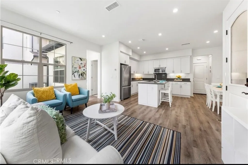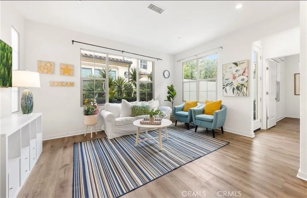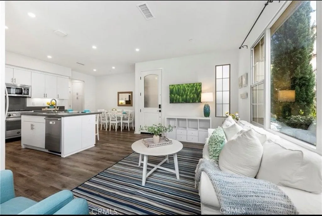 this brand-new residence, constructed by California Pacific Homes in 2019, offers an inviting blend of modern comfort and accessibility. Enjoy the perks of community living with access to parks, pools, and scenic walking trails, while also benefiting from the convenience of being a short distance from the Woodbury Town Center for all your shopping and dining needs. This sunlit abode features an abundance of windows, ensuring a bright and airy atmosphere. The kitchen is a culinary delight, featuring white Thermofoil cabinetry, upgraded Quartz countertops with a stylish backsplash, and an island with seating. Indulge in the top-notch stainless steel appliances, including a free-standing range, upgraded hood, microwave, dishwasher, and a Whirlpool refrigerator. The secluded powder bath boasts a pedestal sink and a well-placed mirror. Private deck located off of the dining room for casual