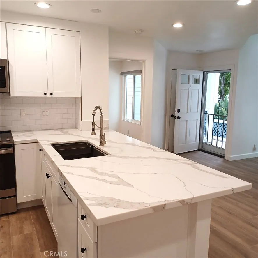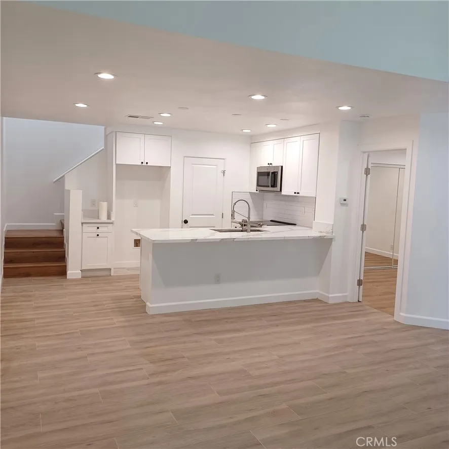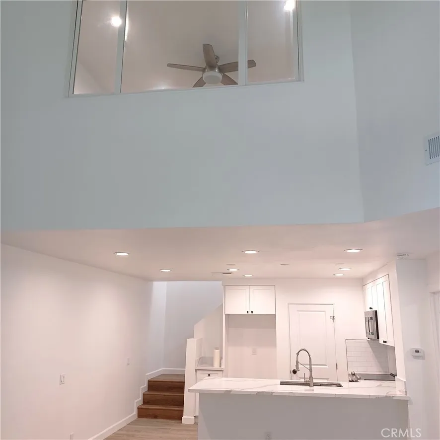 Pristine, white, impeccably clean describes this inviting renovated Woodbridge Townhome located in the Laurels community. Not a shred of carpet is to be found in this charmer, having an all new combo of cement plank tile and vinyl plank. The Living Room is large and airy, with vaulted ceilings, recessed lights, and a gas starter fireplace. The Kitchen sports white cabinetry, stainless steel appliance, and an oversized deep stainless sink. The laundry room is adjacent to the Kitchen, where the Washer and Dryer will remain with the unit. Bring your own Refrigerator. The Home is equipped with new dual-paned windows and sliding doors. The detached 2 car Garage affords 1 space that is shared with the neighbor. This wonderful, move-in ready rental Home showcases a Bedroom suite downstairs, and a Bedroom upstairs, both with recessed lights and ceiling fans. And both Baths have walk-in stone showers with frameless glass doors and white vanities with Quartz tops. This very well maintained home has an entertainers front patio that faces Balboa Court and the community Pool. Youll love this home, and youll love the Lakes, trails, parks and all that the City of Irvine offers.