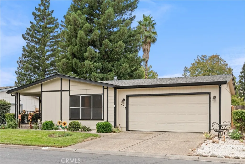 Welcome to this lovely and well maintained double wide mobile home in Chico's favorite gated senior community, Springfield Manor. This move-in ready residence offers beautifully landscaped yard, creating an inviting curb appeal and a peaceful retreat outdoors. Enjoy relaxing or entertaining guests year-round on the spacious covered patio overlooking the private fenced yard. Inside, the home features a sought-after floor plan designed for comfort and privacy, with bedrooms thoughtfully located at opposite ends of the home. Two full bathrooms ensure convenience for residents and guests, including a large primary ensuite with abundant storage and a second bath equipped with a handy jetted walk-in tub, perfect for relaxation and accessibility. The spacious kitchen boasts attractive laminate wood flooring and ample counter space, seamlessly connected to a formal dining area with sliding glass door access to the back porch, ideal for indoor-outdoor living. Off the kitchen, a separate laundry area provides extra functionality and leads directly to a roomy two-car garage with backyard access. Situated in the serene and desirable Springfield Manor, residents enjoy access to an impressive clubhouse, sparkling swimming pool and spa, game room, full sized kitchen, monthly potlucks and a calendar full of social activities, all within a beautifully maintained community. This is a perfect opportunity for comfortable, relaxed living in one of Chico's best senior parks.