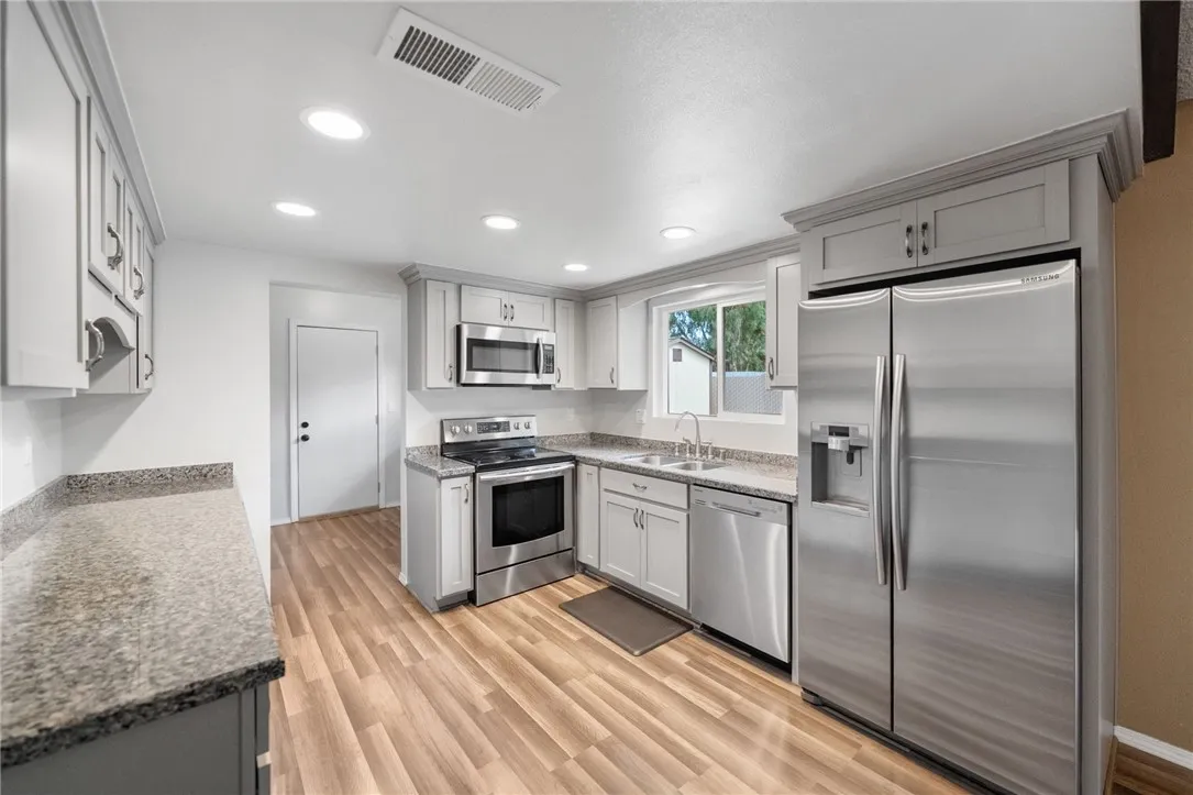 * RV parking * No HOA * Low tax* New roof * Welcome to this updated 3-bedroom, 2-bathroom home tucked away in a quiet cul-de-sac. Youll appreciate the oversized driveway that offers ample space for multiple vehicles, as well as dedicated, gated RV parking area. Inside, you'll find a spacious family room ideal for both everyday living and entertaining guests. The beautifully remodeled kitchen features granite countertops and plenty of soft-close cabinets and drawers while the dining area features wood-beamed ceilings, adding warmth and character to the house. The bathrooms have also been updated with modern vanities and quartz countertops. Additional upgrades include new flooring, new roof, and dual pane windows. The new roof provides peace of mind for years to come while the dual pane windows offer long-term durability, energy efficiency, and year-round comfort. The electrical panel has also been upgraded, ensuring the home is ready for modern demands. Step outside to a quiet, private backyard with a covered patioperfect for relaxing or hosting. As a bonus, an 8x10 Tuff Shed provides extra storage for tools, toys, or hobbies. With no HOA and low property taxes, this home is a smart investment. Dont miss the opportunity to make this home yours!