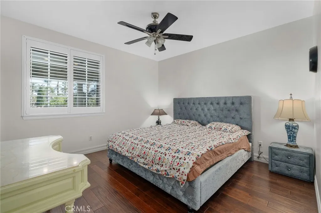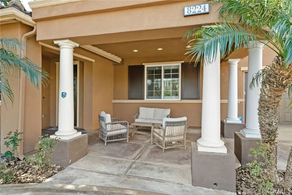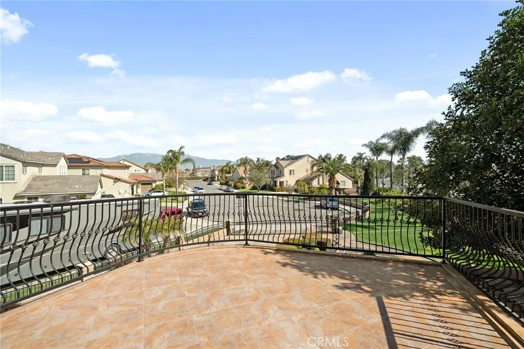 Welcome to this stunning, turnkey, one of a kind home located in the highly sought-after River Glen community of Eastvale. Situated on a spacious 13,068 sq. ft. lot at the end of a peaceful cul-de-sac, this well-maintained residence offers a blend of elegance, comfort, and practicality. With 5 bedrooms, a loft, and 4.5 bathrooms, this home is designed for family living and entertaining. The grand entrance features a circular driveway with a beautiful fountain, providing additional parking for over 8 cars alongside the 4-car garage, totaling over 12 parking spaces! The front yard is beautifully landscaped and securely gated with a combination of block and wrought iron fencing, creating a private oasis with stylish light fixtures and an automatic gate for added security. Relax and enjoy breathtaking views of the city lights and surrounding hills from the custom, oversized balcony and patio, perfect for outdoor gatherings. The backyard is designed for easy maintenance, featuring artificial grass, and offers ample space to build a pool, allowing you to customize your outdoor retreat. Inside, you'll find real wood flooring throughout, complemented by crown molding and plantation shutters on every window. The open-concept living areas are ideal for entertaining, while the spacious primary suite offers a relaxing sanctuary with a cozy sitting area, private balcony, a soaking tub and separate shower, and 2 separate, generous walk-in closets. The downstairs suite has its own en suite bathroom, separate from the guest bathroom. Additional highlights include a convenient upstairs laun