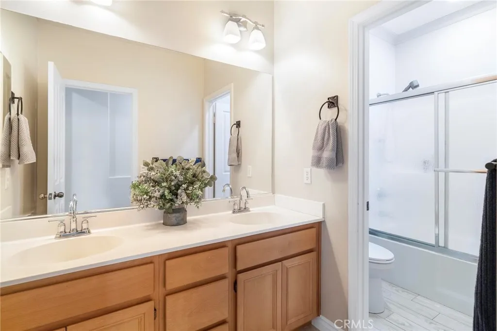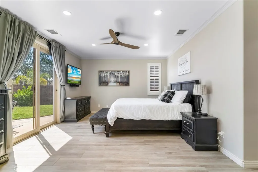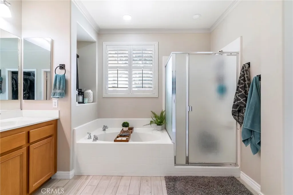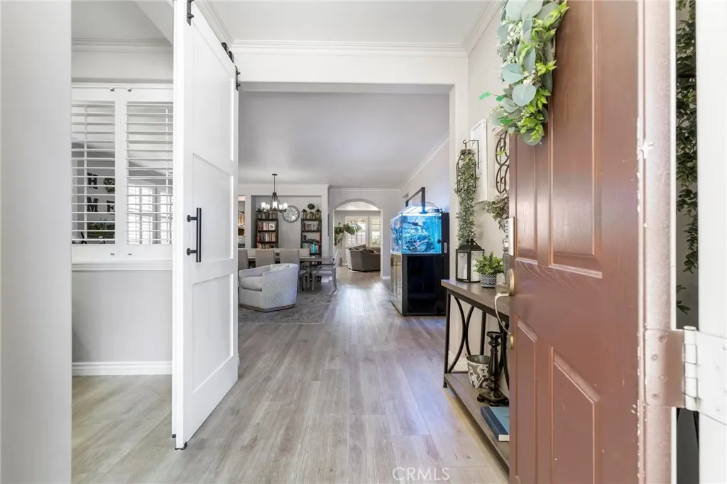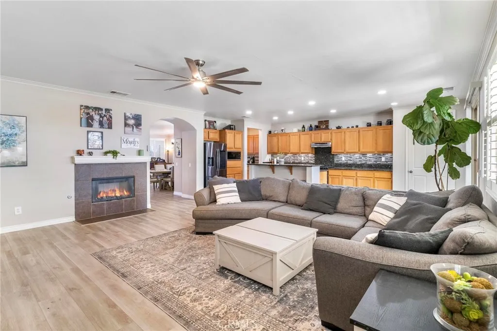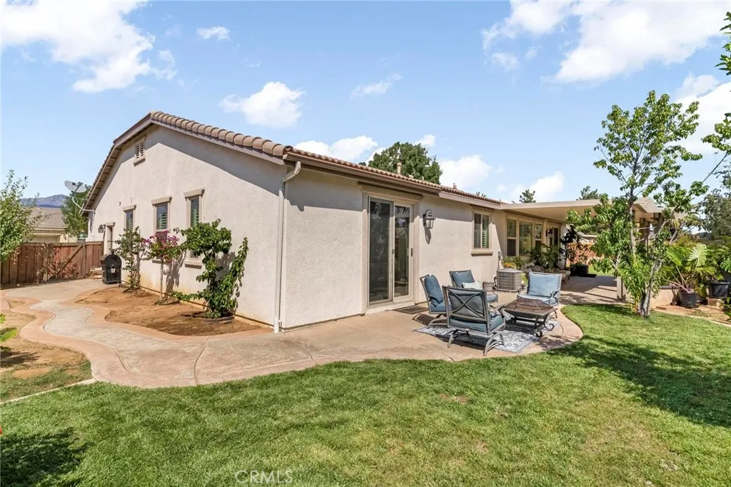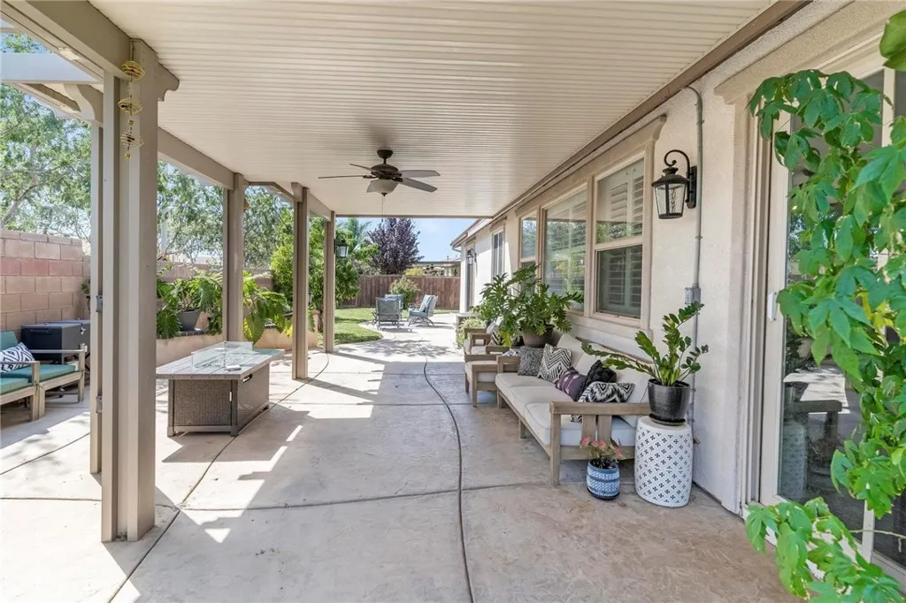 Beautifully upgraded single-story home offering 4 bedrooms, 3 bathrooms, plus an office that can easily serve as a 5th bedroom. From the moment you walk in, youll notice the vaulted ceilings, laminate flooring throughout, dual-pane windows, and custom shutters that bring in natural light and style. The spacious floor plan includes a large living area with sliding glass doors leading to the backyard, a kitchen with a double oven and ample storage, and a convenient indoor laundry room. The primary suite is a retreat of its own with direct patio access, a huge walk-in closet, and abundant storage. This home also features a 3-car garage with RV potential, providing plenty of parking and flexibility for toys or work vehicles. The backyard is designed for both enjoyment and function with a covered patio, two peach trees, one plum tree, and multiple citrus trees, all surrounded by colorful flowers in the front and back. Located in the desirable Sundance Community Association, this property offers a low HOA and a 1.8% tax rate, plus no solarso no payment to absorb. A rare combination of upgrades, functionality, and outdoor charm in a well-maintained communityready to welcome its next owner.