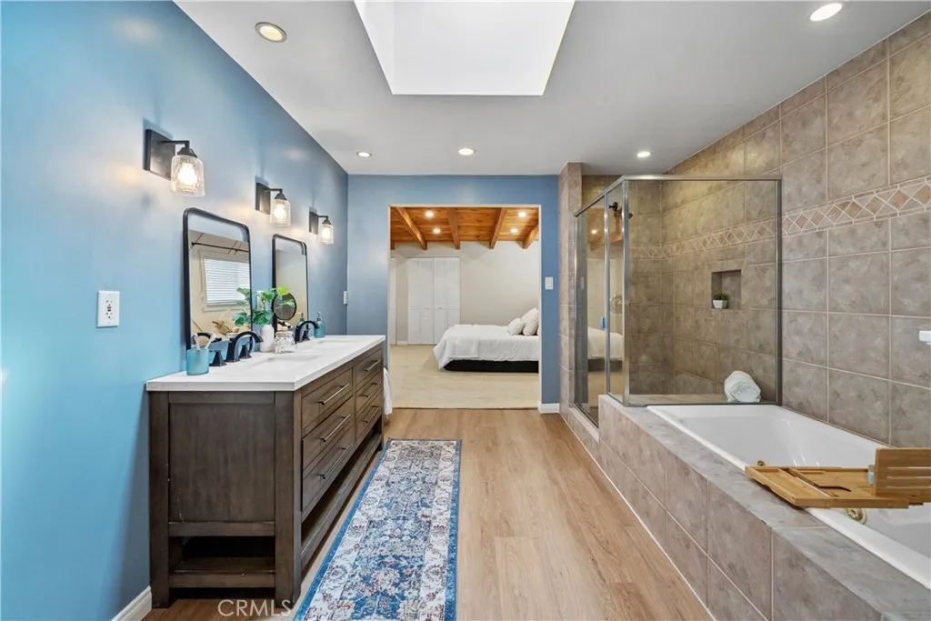 No HOA, No Mello Roos! Tucked at the end of a quiet cul-de-sac in the heart of Santa Clarita, this beautifully updated single-story home offers the perfect blend of timeless charm, smart-home convenience, and high-quality craftsmanship. Step inside to find brand new flooring and abundant natural light that fills the spacious, open-concept living areas. Designed for modern living, the home features Alexa-enabled smart technology, giving you voice-controlled comfort and efficiency in every room. At the heart of the home is a truly special craftsman-style kitchen, thoughtfully designed with handmade cabinetry, quartz countertops, a farmhouse sink, walk-in pantry, and a stunning parota wood island that anchors the spaceboth functional and a one-of-a-kind showpiece. The living and dining areas are perfect for entertaining, with a classic brick fireplace and seamless indoor-outdoor flow. The primary suite is a private retreat with vaulted wood-beam ceilings, direct access to the screened patio, and a spa-like bath with dual vanities, a soaking tub, glass-enclosed shower, and skylight. Two additional bedrooms offer versatility for guests, family, or office use, served by beautifully updated bathrooms and INDOOR LAUNDRY for added convenience. Out back, enjoy multiple outdoor spaces including a custom-built deck, screened patio, and terraced garden bedsall surrounded by mature landscaping and a serene hillside with no rear neighbors. 22403 Los Rouges Drive offers privacy, quality, and modern comfortan exceptional opportunity in one of Santa Claritas most desirable neighborhoods.