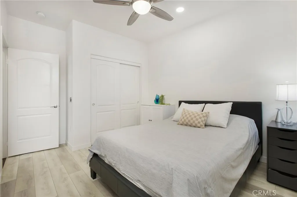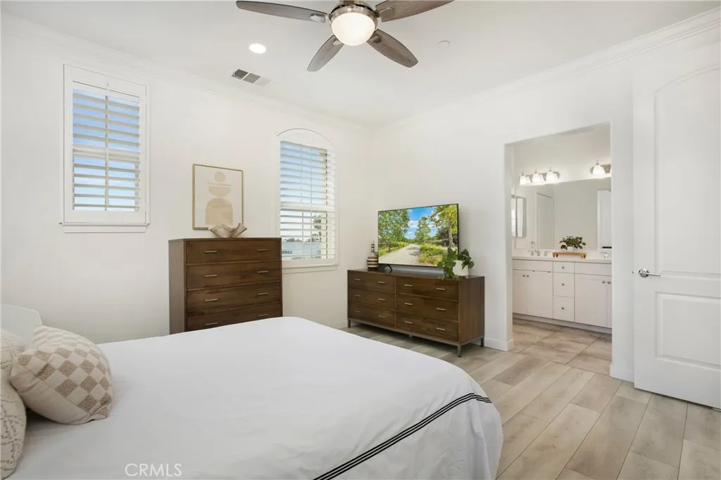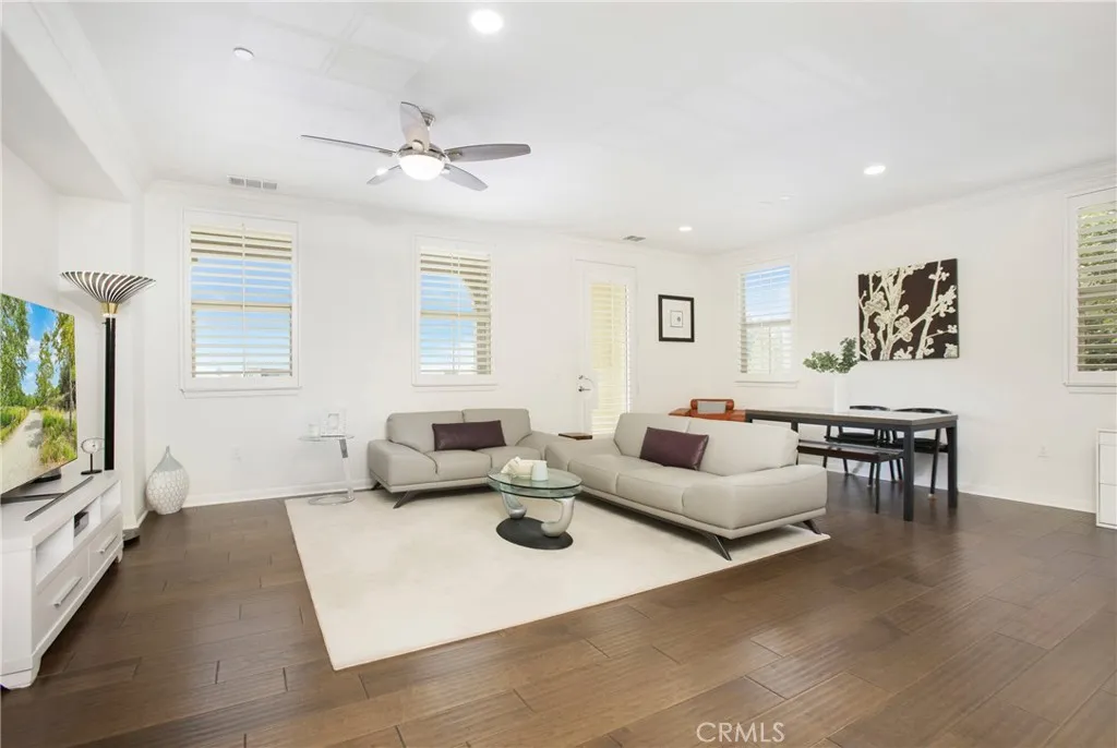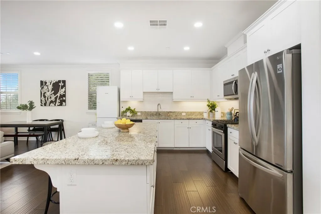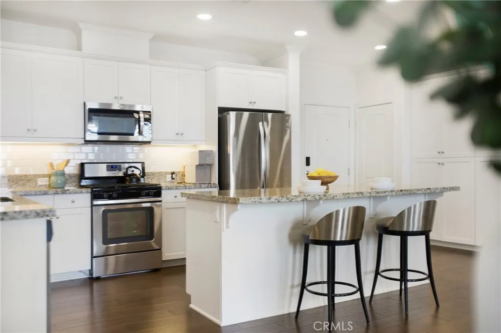 MODERN TOP-FLOOR SINGLE-STORY CONDO IN LA FLORESTA WITH RESORT-STYLE POOL & SPA! This top-floor, single-story condo with a charming Spanish-inspired traditional exterior features 2 bedrooms and 2 bathrooms, designed for comfort and modern convenience. Step into the open floorplan home featuring new engineered wood floors, crown molding, plantation shutters, high ceilings, and recessed lightingall enhanced by abundant windows that fill the space with natural light. The kitchen is open to the living room, creating an ideal space for entertaining. Enjoy granite counters, bright white cabinets, stainless steel appliances, a stylish tiled backsplash, and an island with barstool seating and built-in storage. Built-in cabinets provide extra storage, and waterproof engineered wood flooring adds durability and style. Just off the living room is the extra-long patio, spanning the length of the family room, with sunset views of the Village at La Floresta shopping plaza. Convenience continues in the hallway with a side-by-side in-closet laundry featuring custom shelving for added organization, plus additional hallway cabinets and a coat closet for even more storage. Step into the peaceful bedrooms, both with waterproof laminate flooring and no shared side walls for quiet, restful nights. The primary suite boasts a bright corner location with windows on multiple sides, a walk-in closet with built-in shelving, dual sinks, a bidet toilet, and a glass-enclosed walk-in shower. The second bathroom also features waterproof tile flooring and a new toilet. Enjoy easy access to your home by stai