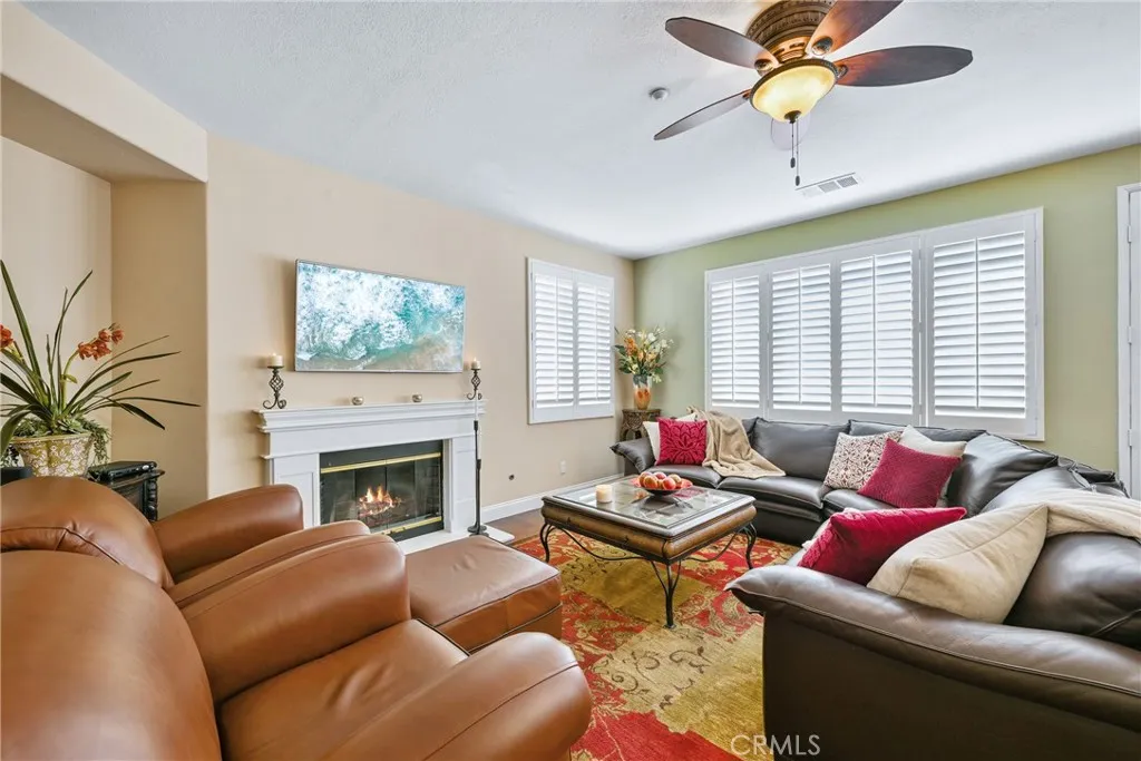 Discover a beautifully upgraded home in the prestigious gated community of Fairways at Alta Vista. This spacious 3-bedroom, 2.5-bathroom residence offers 1,750 square feet of living space with a large bonus room and a peek-a-boo golf course view. Step through a spectacular custom iron door with a glass partition panel into a world of elegance and comfort. The living room, adorned with hardwood floors, a gas fireplace with a mantle, and plantation shutters, invites you to relax and unwind. The dining room, with its chandelier and door to the backyard, offers a perfect space for entertaining guests. As you explore further, you'll find a gourmet kitchen equipped with a modern flair, including granite countertops, a subway tile backsplash, a stainless steel sink, stainless LG appliances, and an adjacent inside laundry room. The spacious bonus room, with its peek-a-boo golf course view, carpet, cathedral ceilings, ceiling fan, and plantation shutters, offers a versatile space for relaxation or entertainment. The primary suite, with its luxurious en-suite bathroom, is a true retreat. The bathroom features a dual vanity with granite countertops, tile floors, a tile shower with a mosaic inlay, a bench seat and large glass doors, and a mirrored walk- in closet. The bedroom itself boasts cathedral ceilings with a ceiling fan. Two additional bedrooms offer carpeted floors, ceiling fans, mirrored wardrobe closet doors, and custom shutters. The hallway features a built-in linen closet and a Nest thermostat. The shared hall bathroom features tile floors, a tub/shower combo with tile inla
