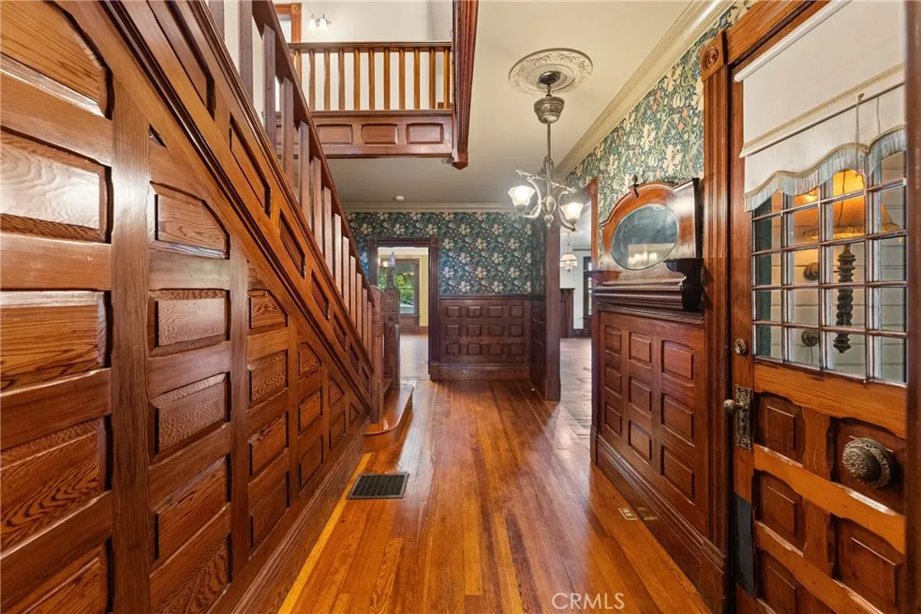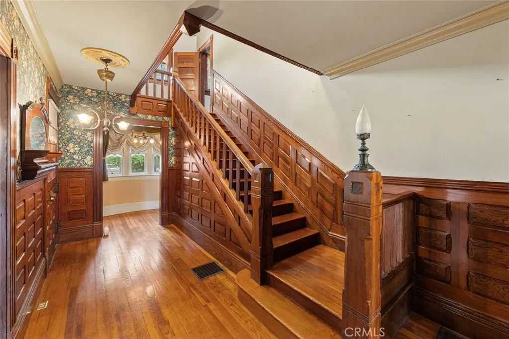 Welcome to Green Gables - a 1891 Victorian Queen Anne steeped in romance & charm. A history-lover's delight! Built just ten years after Redlands, CA, was founded, this stunning lady in green once saw horse-drawn carriages & hand-cranked phonographs. It oversaw the beginning of the citrus boom in Redlands. Today, you can have the special privilege of being connected to your home & the entire city of Redlands in a way few others could even dream of. An enviable & historical status statement. Recently repainted in 2021, this passionately restored 7-bed, 5-bath home retains its original wood floors, exterior & interior Victorian decorative elements, original doors & door hardware, bullseye trim, original windows with historic wavy glass & ornate framework, antique ceiling medallions, and a treasure trove of other Victorian delights. Enter through a solid wood front door featuring its original glass panes & muntins. Inside, find a blend of tastefully hand-painted walls, wood panelling, and beautifully embossed William Morris wallpaper from London, all period-appropriate. Redwood & pine bring warmth to the interior & the grand staircase. The double kitchen features plenty of cabinet & counter space, two sinks, three breadboards, and a butlers pantry with a service window & swinging door to a grand formal dining room. There are original, irreplaceable gems here, like a speaking tube that reaches the second floor, hookups for service bells, and a servant staircase. Antique pocket doors connect the formal dining room to a roomy parlor. Spend quality time here in the parlor, in a pri