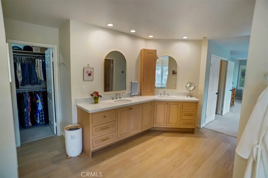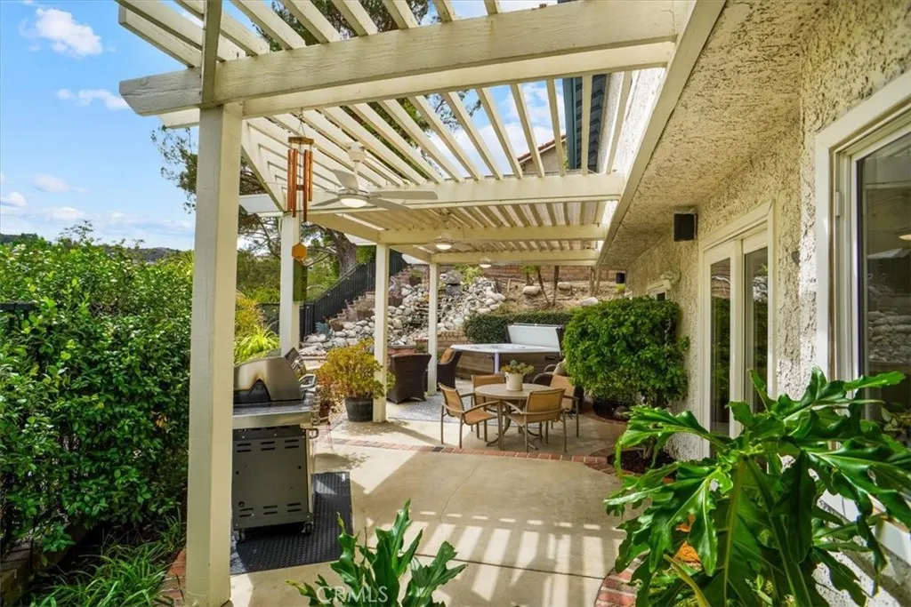 Welcome to this exquisite 5-bedroom, 3-bathroom residence in the coveted Hidden Valley neighborhood of Santa Clarita. This almost 3100-square-foot home sits on a generous pool-sized lot in a serene cul-de-sac, offering the perfect blend of luxury, modern upgrades, and prime location. Step inside to discover stunning wood floors and a bright, open floor plan. The upgraded kitchen, featuring brand-new stainless steel Cafe appliances (2024), granite countertops, and ample cabinetry, is a chefs dream. The main level includes a spacious bedroom and a beautifully remodeled bathroom, perfect for guests or multigenerational living. Upstairs, four additional bedrooms with newer luxury carpet and fresh paint provide versatility for family, guests, offices, or hobbies. Spacious primary bedroom featuring two walk-in closets with custom cabinetry, an en-suite bathroom with dual vanities, a soaking tub, and a standalone shower with custom designer picket and herringbone tile, seamless glass shower doors, quartz countertops, dual sinks, recessed lighting and wood look tile floors. The private backyard is an entertainers oasis, complete with a BBQ area, fire pit, and a soothing waterfall, spa, all framed by lush landscaping and serene views of the nearby mountains. Recent upgrades include a new roof (2024), paid-in-full solar panels (2024). Thats right paid solar thats a significant long-term savings on your utility bills. Tesla charger, a newer HVAC system, and energy-efficient windows with custom shutters, ensuring comfort and sustainability. Additional highlights include a 3-car garage