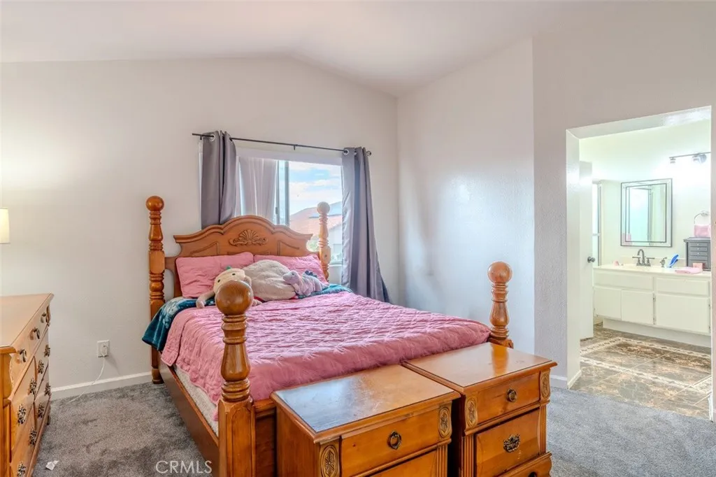 Welcome to this beautifully appointed 5-bedrooms, 4 full baths home. Thoughtfully designed to support both comfortable family living and personalized work-from-home spaces. Perfectly suited for move-up buyers and those new to the area. Step inside to discover a main floor bedroom that offers versatile functionality ideal as a private office or guest room featuring elegant wood flooring and direct access to a well-appointed full bathroom. The inviting living room flows effortlessly through sliding doors to the backyard, creating a seamless indoor-outdoor connection perfect for relaxing or entertaining. The family room contains a cozy fireplace and opens directly to the kitchen, which boasts a tile countertop peninsula with breakfast bar, white appliances, tile flooring, and a spacious pantrya layout designed to inspire culinary creativity and family gatherings. Upstairs, the primary bedroom invites rest and rejuvenation with carpeting, a vaulted ceiling, a ceiling fan, and access to your ample balcony. Luxuriate in the en-suite bathroom featuring a dual-sink granite vanity, a separate shower and jetted tub with elegant dark tile surrounds, and tasteful tile flooringa true retreat. This level also includes a generously sized second bedroom with its own en-suite bathroom, two additional cozy bedrooms with mirrored closet doors, and a shared bathroom complete with a dual-sink vanity and wood-look flooring, ensuring comfort and privacy for every member of the household. The backyard presents a serene slab patio offering ample space to tailor your outdoor living area to your un