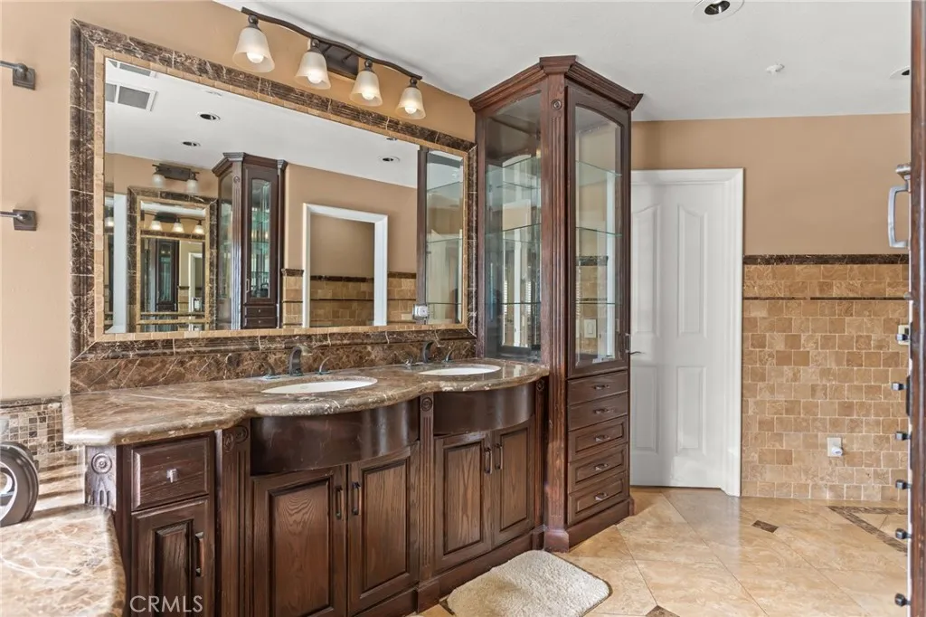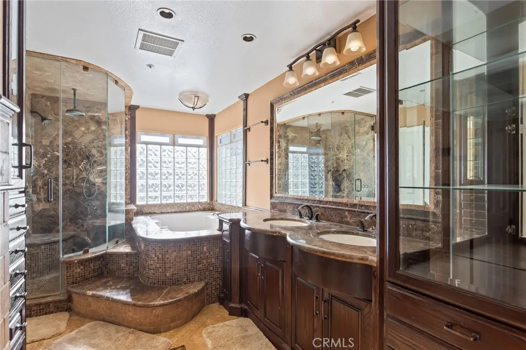 Located on a quiet private Cul-De-Sac with no homes behind. This home features engineered wood flooring, indoor theater(added & permitted), wood stairs & shutters, mahogany kitchen cabinet with pull-out drawers & Lazy Susan, granite kitchen counters & 'Instant Hot' water purifier, recessed lighting, crown moldings, stone wainscoting in bathroom(s), Jacuzzi tub & underfloor heating sits under the marble floors in master bathroom, laundry chute, stainless dishwasher & trash compactor, oversized pantry, custom French doors, built-in cabinet, custom paint, marbled steam rooms in downstairs & primary bathrooms, custom organizers in closets, epoxy floors in garage with custom storage, wall mounted TV in bonus room & Projector in home theater included. Professional landscape with outdoor fireplace & 10 burner built-in BBQ grill & more!