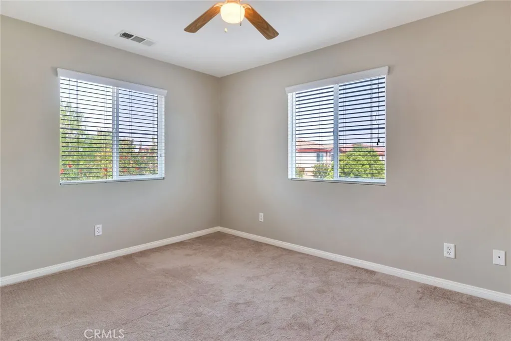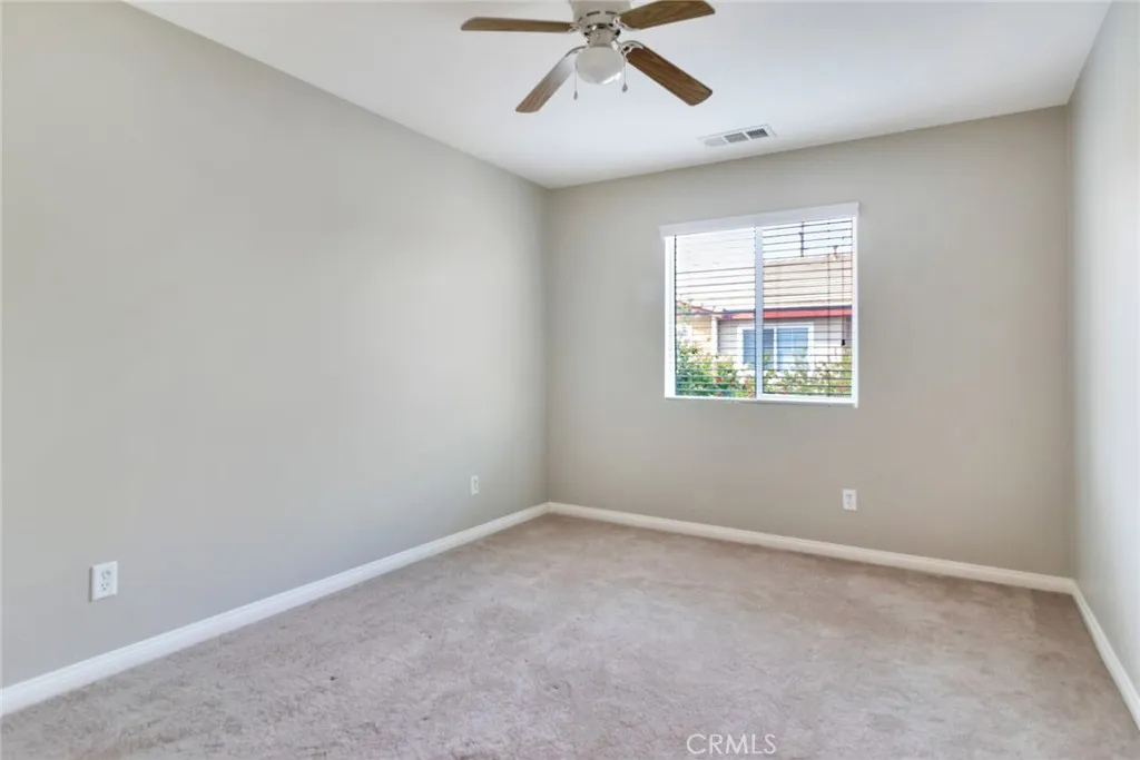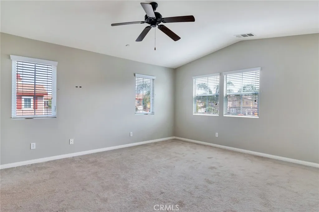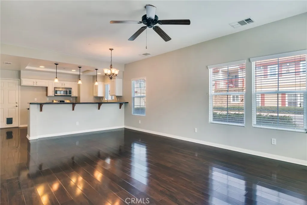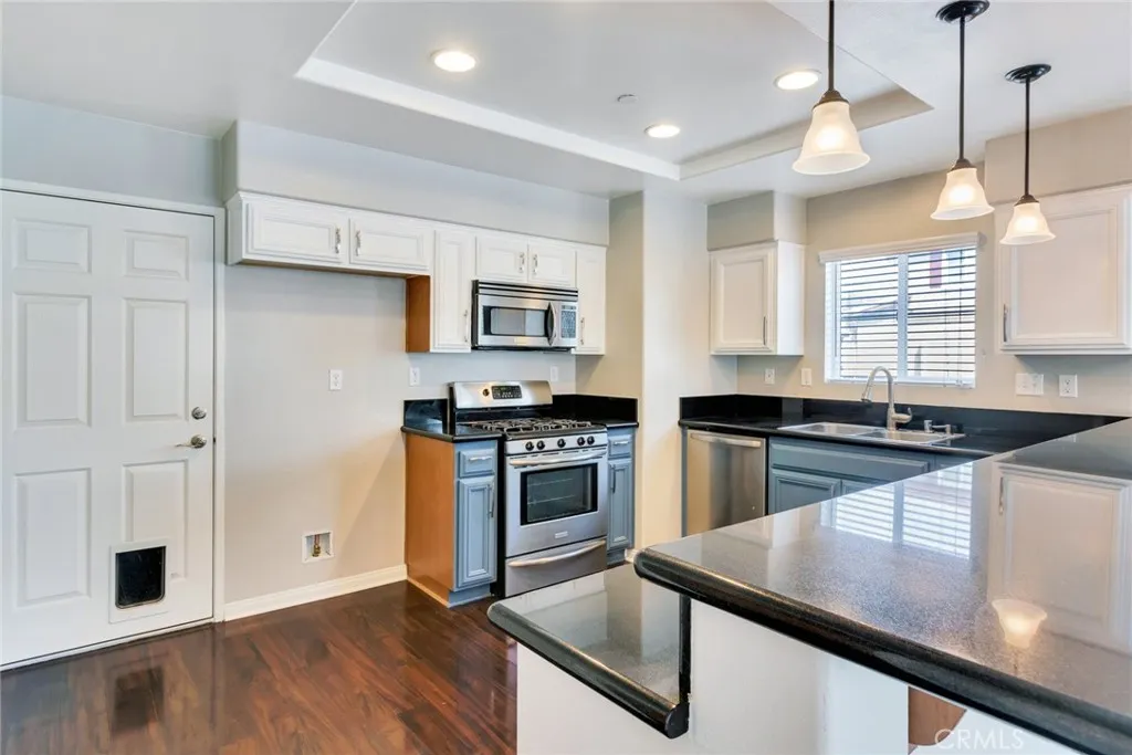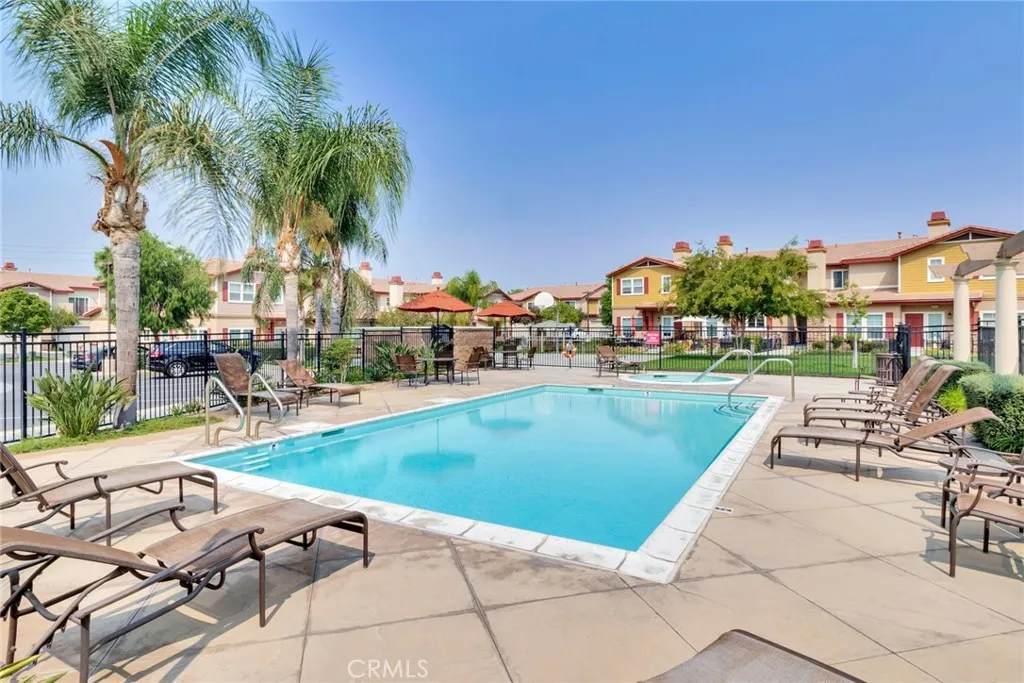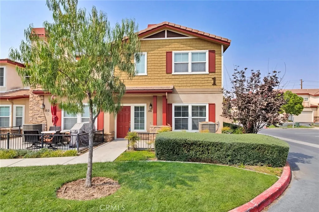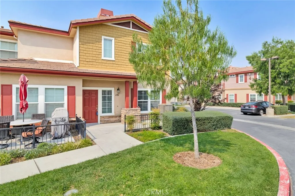 Gated Community of Villa Valencia. The largest floor plan in the community with 3 bedrooms and 2.5 baths. End unit with 1 sharing wall. Walk in closet in the Primary Bedroom and dual sinks in the Primary bath. Private upstairs balcony. Kitchen has stainless steel appliances and granite counters. Great room and Primary Bedroom with a gas fireplace. Laminate wood floors on the main floor and carpet on stairs and second floor. Attached 2 car garage. HOA amenities include pool/spa, clubhouse, picnic area with BBQ, playground, and a half basketball court.