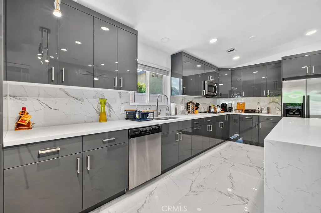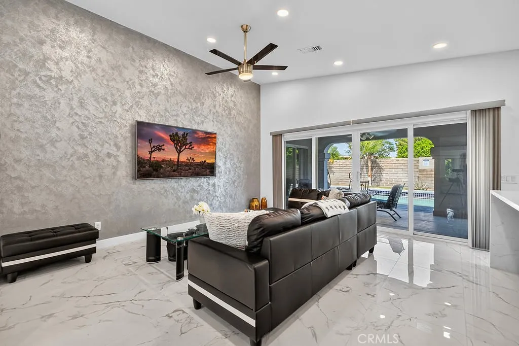Fully furnished and beautifully remodeled, this 3-bedroom, 2-bath single-story pool home in Cathedral City offers the perfect blend of comfort and resort-style living. Step inside to a spacious high-ceiling living room furnished with couches, a coffee table, bean bag loveseat, dining set, and treadmill. The family room, complete with additional couches and a coffee table, flows seamlessly into the chefs kitchen, which is truly the heart of the home. The kitchen boasts glossy lacquer cabinetry, an oversized island with seating, a built-in range, double oven, microwave, dishwasher, refrigerator, and is fully stocked with every dish and utensil you could needideal for both everyday living and hosting gatherings. The primary suite is a relaxing retreat with dual closets, direct access to the backyard, and a spa-inspired bathroom featuring double sinks, a soaking tub, tiled walk-in shower, and private water closet. Two additional bedrooms are comfortably furnished with beds, nightstands, and ceiling fans, and share a remodeled walk-in shower bathroom. Flooring includes tile throughout the living areas and laminate wood in the bedrooms, along with a separate laundry room offering cabinetry and a sink for added convenience. The backyard is designed for entertaining and relaxation, featuring a sparkling pool and spa, outdoor dining area with BBQ and flat grill, cozy seating around the fire pit, two egg chairs, four lounge chairs, a hammock, and an expansive dog run. The front yard is lined with mature trees providing privacy and tranquility. A two-car garage is available for tenant