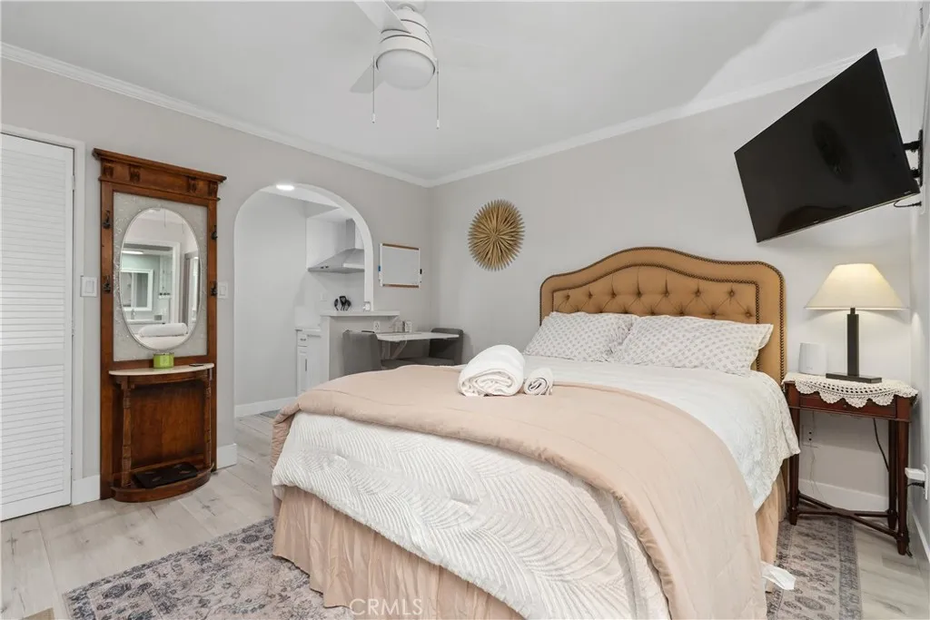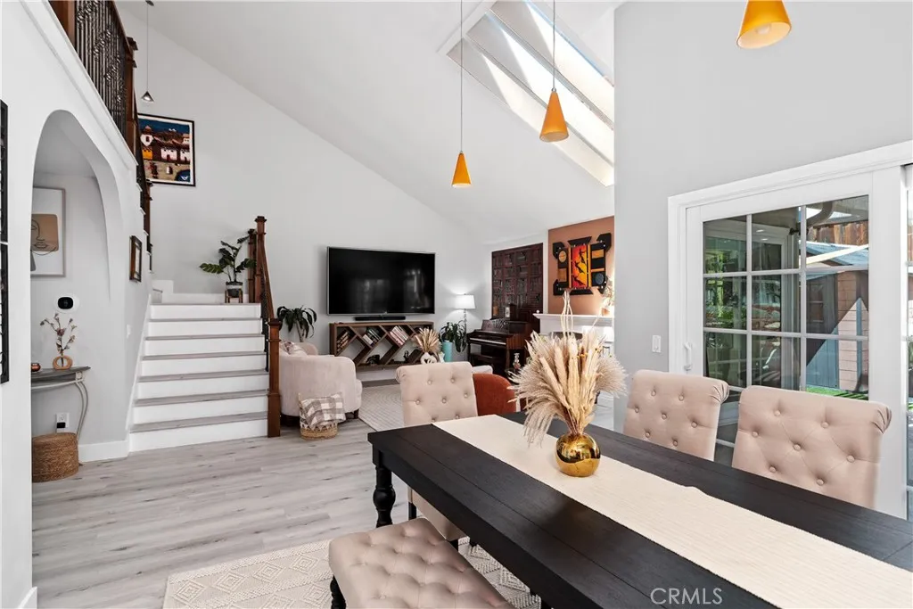 This stunning, fully remodeled residence masterfully blends modern luxury with functional design. Spanning 2,120 square feet on a generous 4,900-square-foot lot, this exquisite home offers ample space for both indoor and outdoor living. The property boasts 3 bedrooms and 3 full bathrooms, plus an elegant powder room, ensuring comfort and privacy for all residents. Each bedroom features an en-suite bathroom and a ceiling fan, creating a private retreat. The spacious master suite is a haven, complete with a double-sink en-suite bathroom, a sleek standing shower, and a freestanding soaking tub. A STANDOUT FEATURE IS THE VERSATILE DOWNSTAIRS SUITE, EQUIPPED WITH A UPGRADED MINI KITCHEN, REFRIGERATOR, COOKTOP, AND PRIVATE ENTRANCEPERFECT FOR RENTAL INCOME OR AS AN IN-LAW SUITE FOR MULTI-GENERATIONAL LIVING. The living area impresses with a vaulted ceiling, skylights that flood the space with natural light, and a cozy fireplace with a chic marble mantel. This open-concept design flows seamlessly into a dining area framed by large windows, inviting abundant natural light. The chefs dream kitchen features a expansive quartz island with a sink, matching countertops, modern pendant lighting, crisp white cabinetry, and professional-grade stainless-steel appliances. Light wood flooring and thoughtful decor elevate the space, while a door provides convenient access to the side yard. Recent upgrades include a state-of-the-art, energy-efficient air conditioning system and a tankless water heater, ensuring modern comfort and sustainability. The outdoor spaces are equally captivating. The f