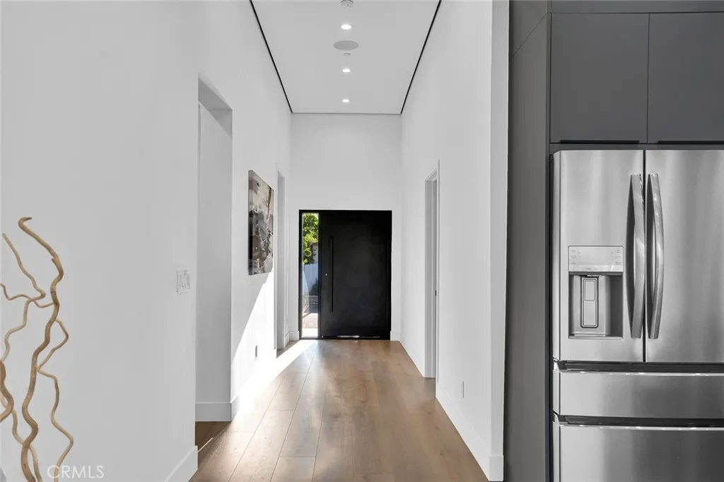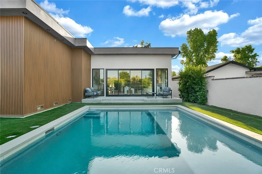 Come see this beautifully almost brand new- 3-bedroom, 3.5-bathroom pool home in Encino, offering 2,107 sq. ft. of stylish living space. The impressive 12-foot-high entry ceiling and pivot front door create a grand first impression, while high ceilings of 10 feet, throughout the house, make the home feel open and spacious. The layout includes a generous junior suite and a large primary master bedroom with a stunning walk-in closet and fireplace. The brand-new chefs kitchen has plenty of cabinets, brand new appliances and features Taj Mahal natural stone countertops and backsplash, opening to the dining and family room for effortless entertaining. Recessed lighting throughout the house, family room has a modern fireplace. Large sliding doors flood the space with natural light and connect you to the backyard retreat. Outside, enjoy the sparkling Baja-style pool with mini pebble plaster finish, surrounded by drought-resistant landscaping and synthetic grass for year-round beauty and low maintenance. This modern home has been thoughtfully upgraded with new heating and air conditioning, updated electrical and plumbing, and built-in sound speakers in the living area. This beautiful home has a laundry room with ample cabinets. There is a solar panel system. Located close to shops, parks, and quick access to the 101 Freeway, this home blends convenience with luxurious California living.