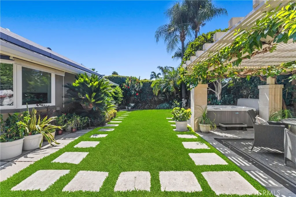 Welcome to your private Laguna Hills oasisa beautifully maintained, single-level home surrounded by mature tropical landscaping that exudes serenity and privacy. A gated entry leads to a charming courtyard with stone walkways, while custom concrete pavers extend throughout the front and back yards, creating seamless, elegant outdoor spaces. Designed for both relaxation and entertaining, the backyard features a soothing hot tub, a BBQ area, covered dining and sitting spaces, and a fire pit seating area, all set amid lush, tropical greenery. Inside, dual-pane windows and recessed lighting throughout fill the home with light, while a living room fireplace adds warmth and charm. The kitchen boasts a bay window overlooking the backyard, stone countertops, and a built-in wine fridge, blending style and functionality. Freshly painted and professionally cleaned, this home is move-in ready. The 2-car garage provides abundant, easily accessible storage, and the entire property offers unmatched privacy in a peaceful neighborhood. With thoughtful design, luxurious finishes, and an effortless indoor-outdoor lifestyle, this residence is a true sanctuary for comfort, entertaining, and everyday living.