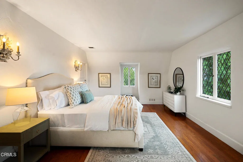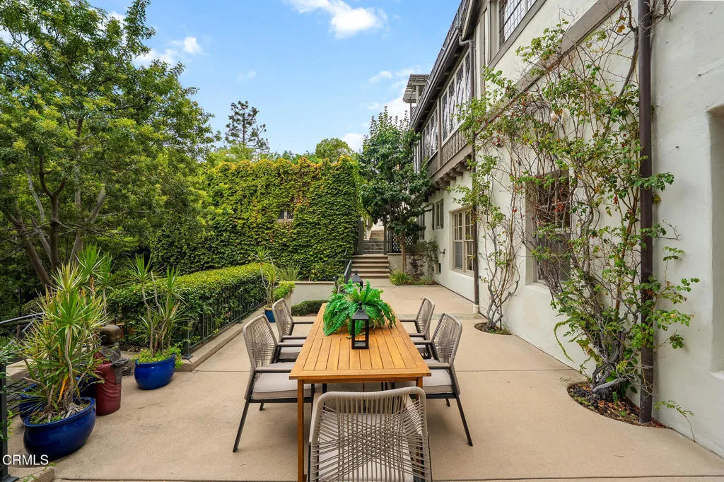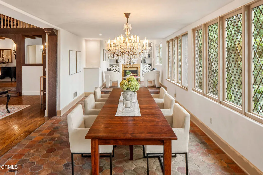 Welcome to Valley View cottage--a treasured piece of Pasadena's architectural heritage designed by Wallace Neff nearly a century ago. One of thirteen beautifully restored cottages on the gated grounds of the historic Huntington Hotel, Valley View was built in 1926 the hotel's long-time owner and manager D.M. Linnard. Rich with timeless character, the residence blends Tudor Revival and storybook cottage styles with hints of a Grimmian fairytale. As you enter, striking interiors and design flourishes echo the home's impressive exterior. In the great room, a nearly 20' ceiling features exposed trusses and beams, creating a grand space for entertaining. The formal dining room glows with natural light from a thirty-foot wall with diamond-shaped mullioned windows while the beautifully updated eat-in kitchen connects to a sunlit breakfast room. Completing the main level, you'll find a guest bedroom / media room, three-quarter bath, and the luxurious primary suite with private balcony and spa bath. Upstairs, two bedrooms share a bathroom, with the southeast bedroom featuring a private balcony and sweeping valley views. The extremely versatile lower level, with its own entrance, offers a bedroom ensuite, two offices, a gym, two kitchens, and flexible living spaces. Outdoors, tiered gardens recall a countryside manor, equally suited for entertaining or a quiet evening under the stars in the Jacuzzi. With four deeded parking spaces plus a three-car garage, guests come and go with ease. As a resident of Huntington Circle, you'll enjoy direct access to the Langham Hotel's world-class am