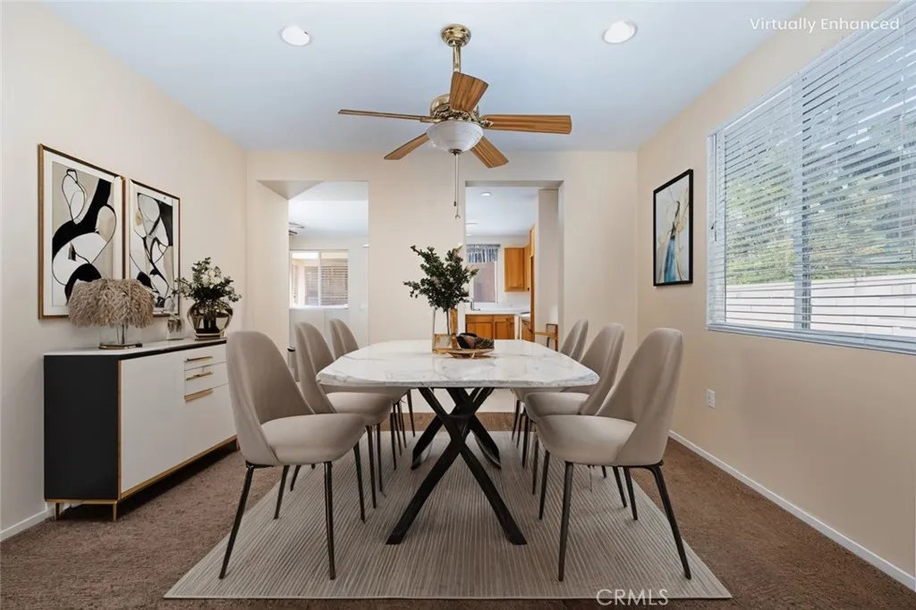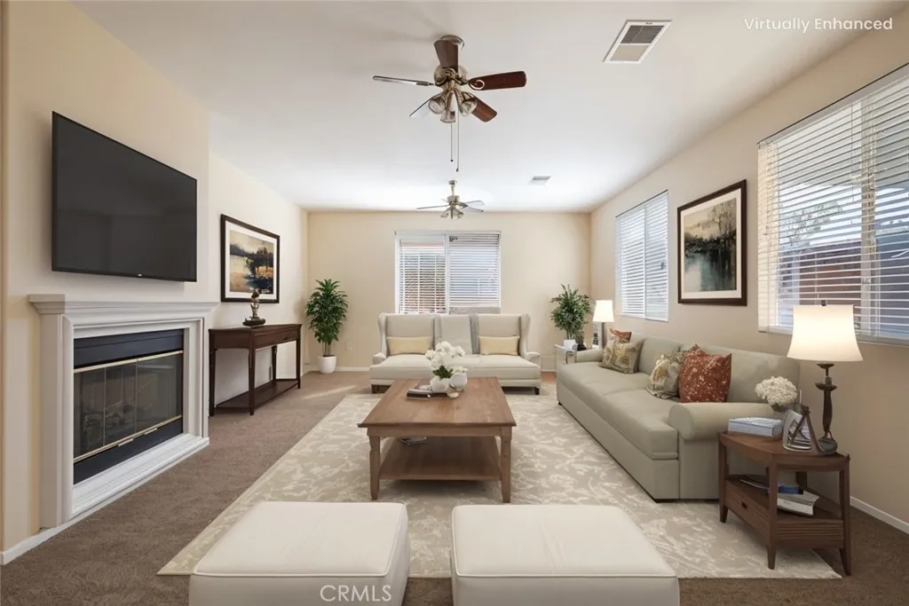 Get ready to enjoy the good life at Four Seasons 55+ community! Located on a corner lot, this home is 1,809sqft with 2 bedrooms and 2 bathrooms with an office/den area. Light and bright kitchen is open to the family room with a fireplace and ceiling fans. The kitchen conveniently connects to the dining room through a butlers pantry. French door leads to nice size backyard with an alumawood patio cover to enjoy the outdoors. Plenty of room for a barbeque or an herb/vegetable garden. Sprinkler system with auto timer. The oversized primary suite features a walk-in closet, a walk-in shower, and dual sinks. Inside laundry room and 2-car attached garage. New carpet and freshly painted interior make this home ready to move in. Four Seasons 55+ community in Hemet is the perfect place to enjoy everything youve worked for! This community is centered around an 18-hole championship golf course. There are a wide range of amenities at the Lodge clubhouse, including a bistro, hair and nail salon, library, computer room, billiards room, card room, banquet hall, a luxurious theater offering free movie showings 3 times a day, state-of-the-art fitness center, Olympic-size swimming pool, spa, outdoor BBQ area, social clubs, and group travel opportunities. Many exceptional amenities to enjoy!