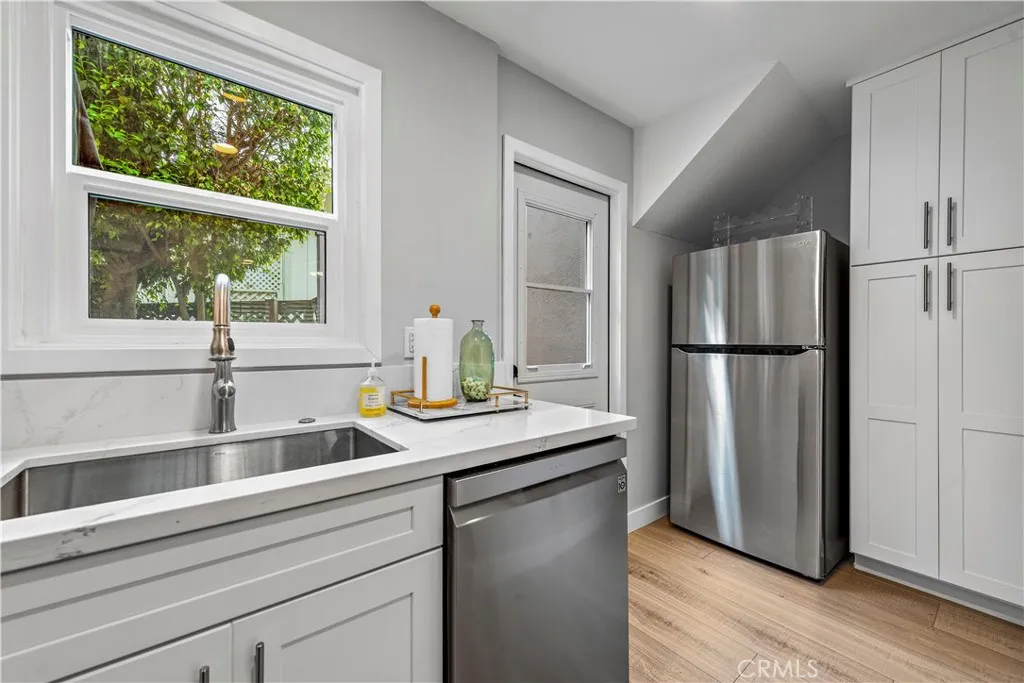 Wonderful North Laguna fully furnished studio apartment just a block from Heisler Park and Picnic Beach! This completely updated studio apartment has great light with big windows and plantation shutters, new laminate flooring throughout, LED recessed lighting and new ceiling fan, good closet space with mirrored closet doors, front loading washer and dryer, gorgeous bathroom with carrara style quartz vanity, tiled shower, dual shower heads, and seamless glass shower door, separate kitchen is fully upgraded with stylish white shaker cabinets, quartz counter tops, all new stainless steel appliances including refrigerator, dishwasher, gas range, and microwave, coffee bar, pantry cabinets, and large private back patio off the kitchen, plus parking for one small car, motorcycle, golf cart or maybe just a bike (which isn't really needed in this great location) off of back alley. Quick stroll down to Urth Caffe or locals favorite beach Diver's Cove or walk to any of the other downtown shops and restaurants Laguna Beach has to offer! All utilities including WiFi are included in the rent.
