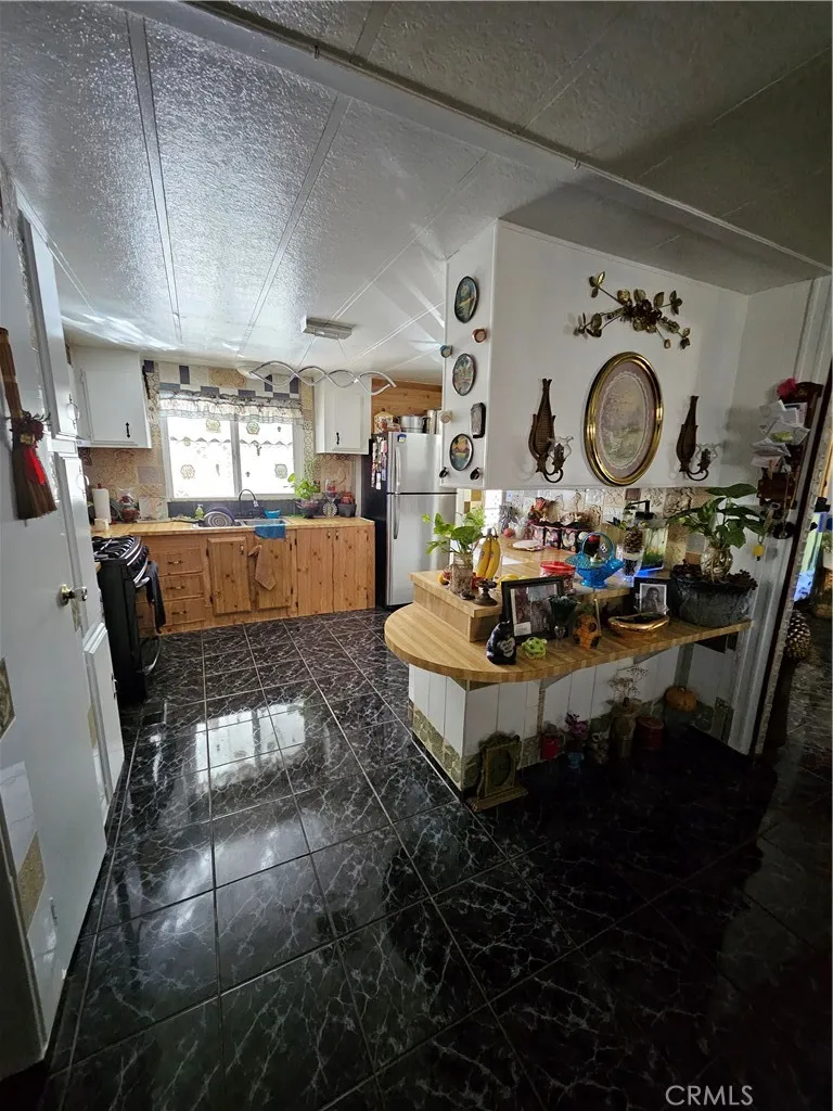 Welcome to this charming and well-cared-for 3 bedroom, 2 bathroom manufactured home, offering a warm and inviting atmosphere with plenty of living space. Step into a bright, open dining area with large windows, custom tile accents, and a modern light fixture that adds a stylish contemporary feel. The kitchen features generous counter space, butcher-block style countertops, white cabinetry, tile backsplash, gas stove, stainless steel refrigerator, and a convenient peninsulaperfect for prepping meals, A comfortable living room with plenty of room to entertain.