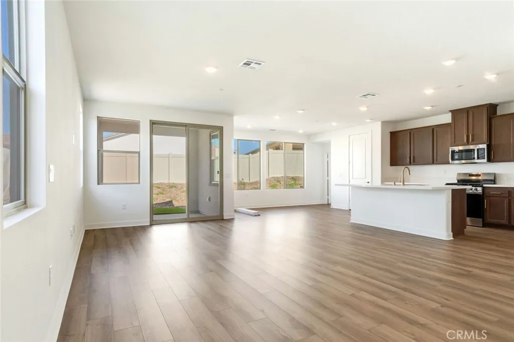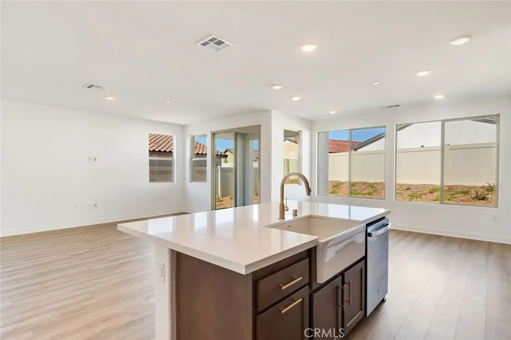 Move-in Ready Home! This beautifully appointed residence features a stucco patio cover, an 8 entry door, and thoughtfully selected interior upgrades throughout. The primary bath includes a fiberglass shower, while Bath 2 offers a fiberglass tub with a classic subway pattern. The kitchen is equipped with a GE 30 freestanding gas range appliance package with stainless steel microwave hood, Nutmeg shaker cabinets with satin bronze 7 bar pulls, Simply White quartz countertops, an upgraded champagne bronze pull-down faucet, and an upgraded Elkay white farmhouse single-bowl fireclay sink. Additional highlights include pendant light pre-wiring at the island, luxury vinyl plank flooring in common areas, carpeted bedrooms, and vinyl flooring in bathrooms and laundry. The covered patio is prewired for a ceiling fan, and the great room is flat-screen TV ready with conduit. Situated on a 5,887 SF lot.