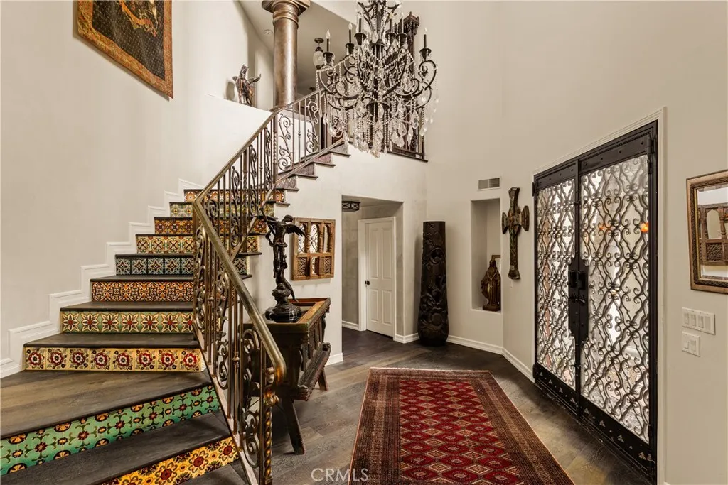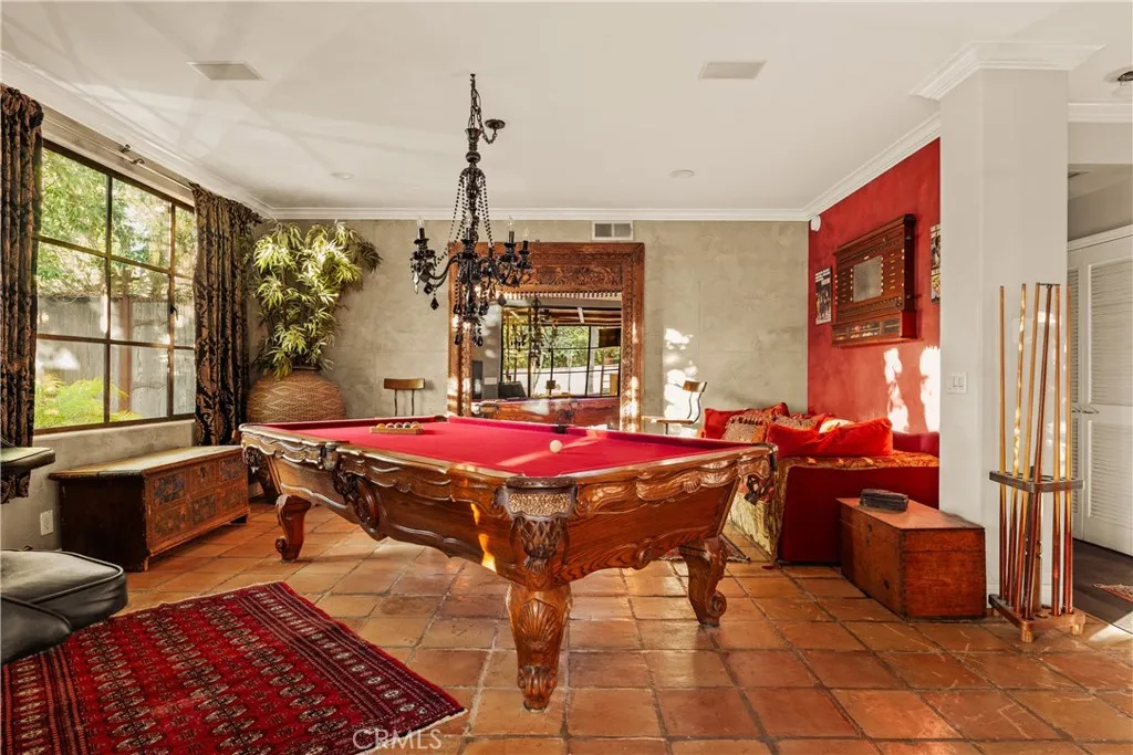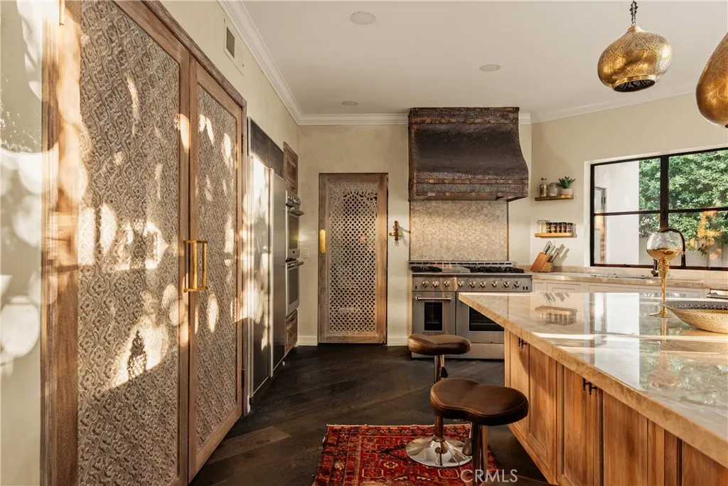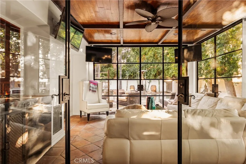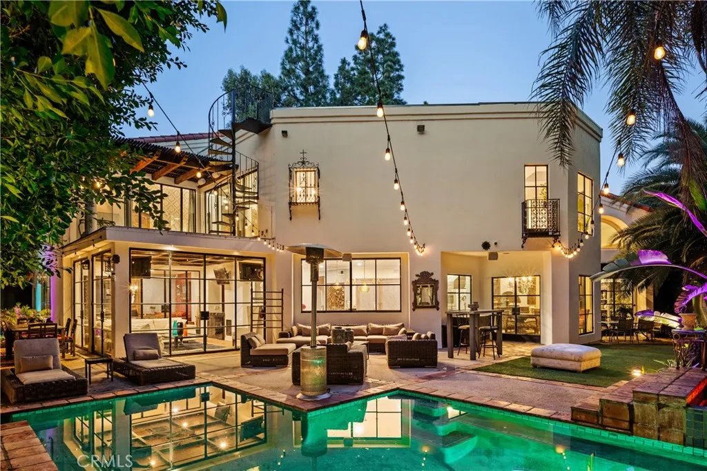 Tucked away behind gates just off Ventura Boulevard, this Mediterranean-style retreat offers premier Encino living with unmatched privacy and amenities. A long, gated circular driveway leads to a stately motor court and three-car garage, framed by lush landscaping and mature trees that shield the home from the street. Step through custom wrought iron doors into a dramatic foyer, where soaring ceilings, a sweeping staircase, and elegant tile floors set the tone. The main level features a grand family room with an ornate fireplace, a formal dining room, a sleek bar, a game room, and a glass-enclosed sunroom with a beverage station. The spacious kitchen is designed for gathering, while a separate maids suite with a private bath and laundry area provides convenience and flexibility. Upstairs, all bedrooms are thoughtfully arranged on the same level. The magnificent primary suite spans four rooms, offering a fireplace-warmed bedroom, sitting room, dressing room, and a spa-inspired bathroom with water closet. A private elevator ensures easy access. Each bedroom showcases treetop views through expansive windows, while a generous outdoor lounge connects to a rooftop deck via spiral staircaseperfect for sunset entertaining. The resort-style grounds include a sparkling pool and spa, outdoor dining area, and built-in barbeque, all enhanced by a Sonos sound system for seamless entertaining. With 5 bedrooms, 4 bathrooms, and over a third of an acre of serene grounds, this residence delivers both elegance and comfort in an unbeatable location close to freeways, restaurants, and shopping.