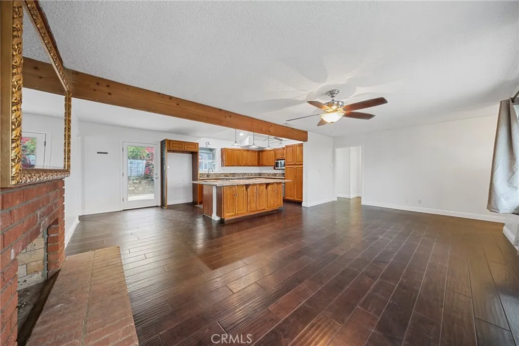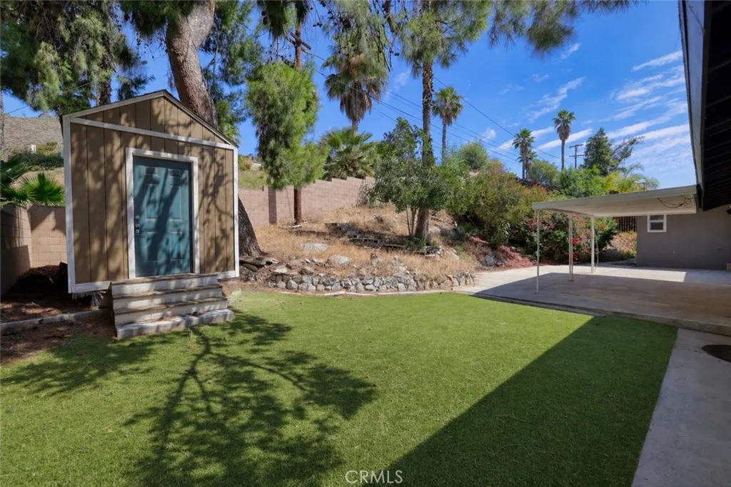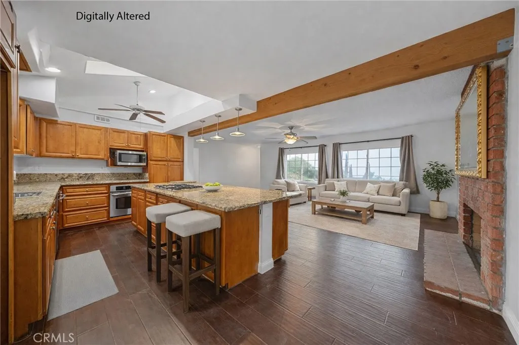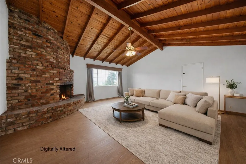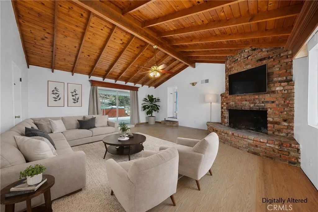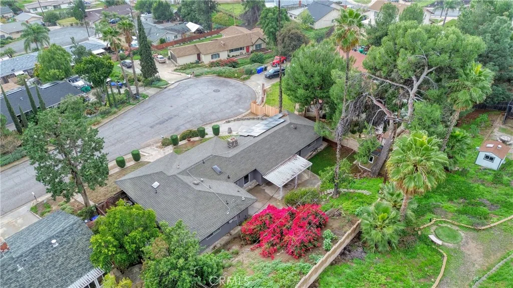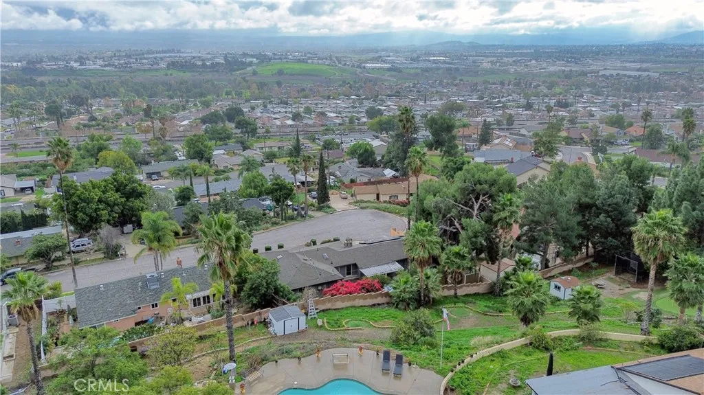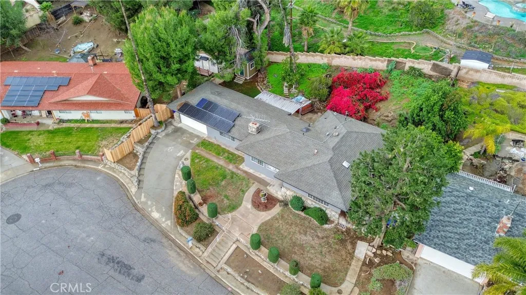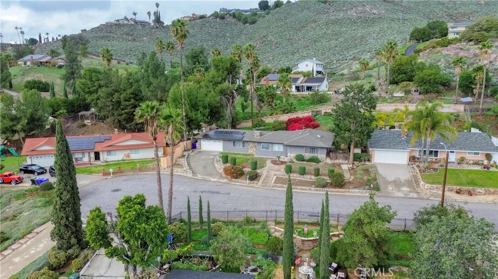 Welcome to this beautifully maintained and move in ready single story home tucked away on a quiet cul de sac in Jurupa Valley. Offering 3 bedrooms, 2 bathrooms and 1,855 square feet of comfortable living space on a large 10,019 sq ft lot. Originally built in 1960, the home has been thoughtfully updated over the last decade, including all new paint on the interior and exterior, blending mid century character with modern convenience. From the moment you arrive, you'll notice the excellent curb appeal and pride of ownership. Step inside to find wood flooring throughout and a bright, open layout thats perfect for both daily living and entertaining. The kitchen has a vaulted ceiling with a skylight, granite countertops, and lots of cabinetry ideal for any home chef. The adjacent living and family rooms each feature a large cozy brick fireplace, creating a warm ambiance for gatherings or relaxing evenings at home. Both bathrooms have been stylishly updated, with the hall bathroom also enhanced by a skylight that fills the space with natural light. Energy efficient dual pane windows, central heating & air, and a solar panel system keeps the interior comfortable year-round while helping to reduce utility costs. Indoor laundry with storage and lots of counter space adds everyday convenience. Outside, your own private backyard oasis awaits with artificial grass throughout the yard. The large backyard is ideal for entertaining, featuring a large covered patio for weekend barbecues and an above-ground hot tub for relaxing under the stars. Enjoy panoramic city views from the front yard,