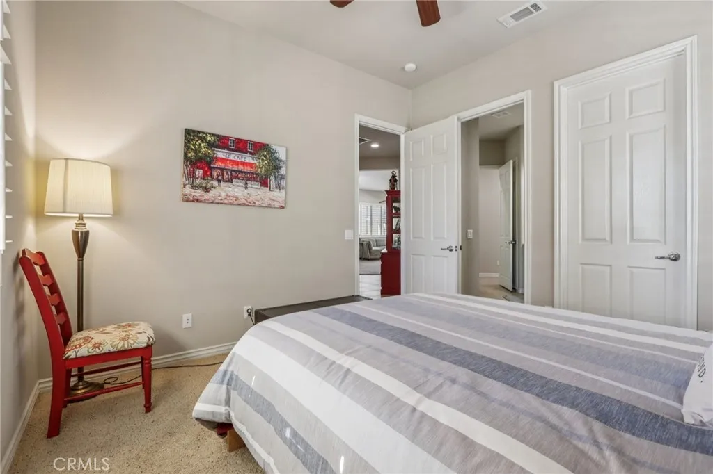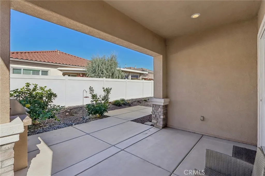 Welcome to thoughtfully designed living in the desirable 55+ Solera Diamond Valley Community by Del Webb. This beautifully maintained 1,689 sq. ft. home offers standout curb appeal with drought-tolerant landscaping, a stone walkway leading to a welcoming front porch, and elegant stone inlay accents on the front pillars. Inside, the home features a desirable two-bedroom, two-bath layout plus a den, ideal for a home office or flexible living space. French doors open to the den, adding character and privacy. The open-concept kitchen serves as the central gathering space, showcasing granite countertops, custom-painted cabinets, recessed lighting, and a spacious pantry. The kitchen flows seamlessly into the living room, where a cozy fireplace anchors the space for everyday comfort and entertaining. Plantation shutters and ceiling fans are found throughout the home, enhancing both style and comfort. The primary bedroom is generously sized with a very large closet, while the primary bathroom features both a soaking tub and a step-in shower. The guest suite includes its own walk-in closet and attached bathroom, offering privacy for visitors. The laundry room is notably spacious with extra storage and custom-painted cabinetry, continuing the thoughtful finishes found in the bathrooms. For added convenience, the refrigerator, washer, and dryer are included. Out back, enjoy a private setting with a California patio, drought-tolerant landscaping, and a built-in BBQ, perfect for relaxing or hosting gatherings year-round.