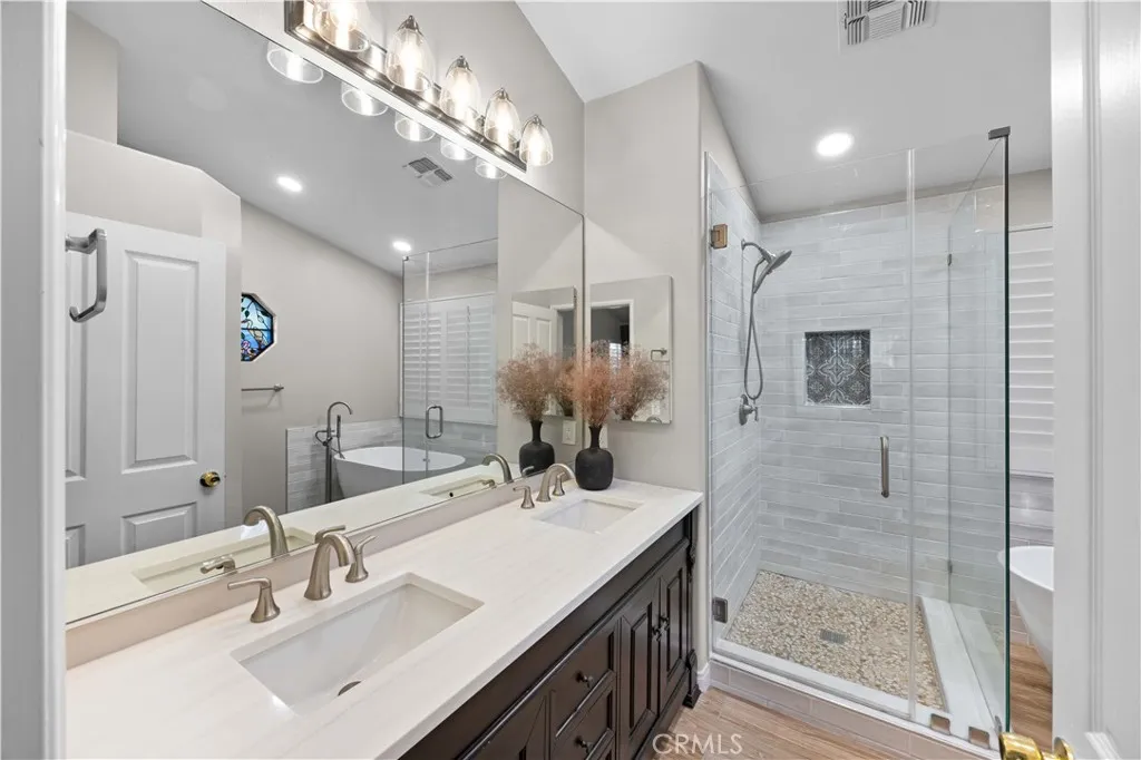 Stunning Home in Valencia This beautifully remodeled 4-bedroom, 3-bathroom home is situated at the end of a cul-de-sac in one of Valencias most desirable neighborhoods. Designed for both comfort and style, the home features soaring high ceilings, modern finishes, and an open, inviting layout. The main level includes a guest bedroom and a full bathroom, perfect for visitors. Upstairs, the spacious primary suite offers high ceilings and plenty of room to relax. The ensuite bathroom features a standalone tub, a walk-in shower, a double vanity, and a private toilet room. There are two additional bedrooms and one full bathroom upstairs. The remodeled kitchen is sleek and modern. A separate laundry room comes included with washer/dryer and a three-car garage provides added convenience. Step outside to an enormous backyard, ideal for entertaining, with a great playground and a designated area for pets. The outdoor space is perfect for hosting, with beautiful valley views. Located in a well-maintained community with an HOA that offers a pool, walking trails, and parks. Just minutes from top-rated schools, dining, Town Center, and grocery stores. A true Valencia gemmove-in ready and waiting for you!!