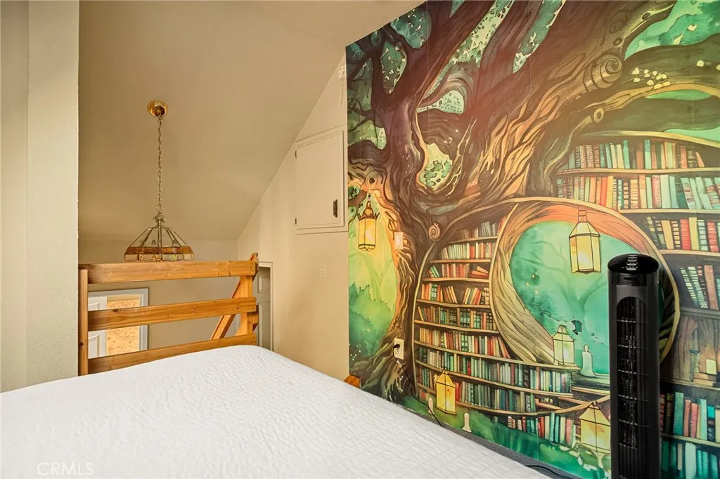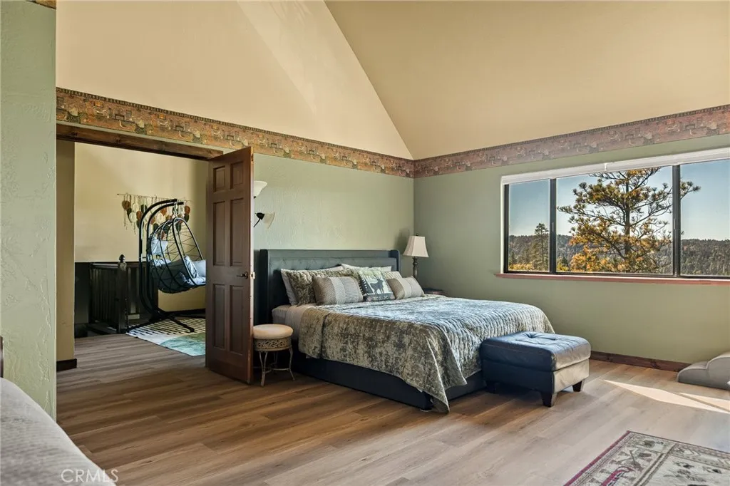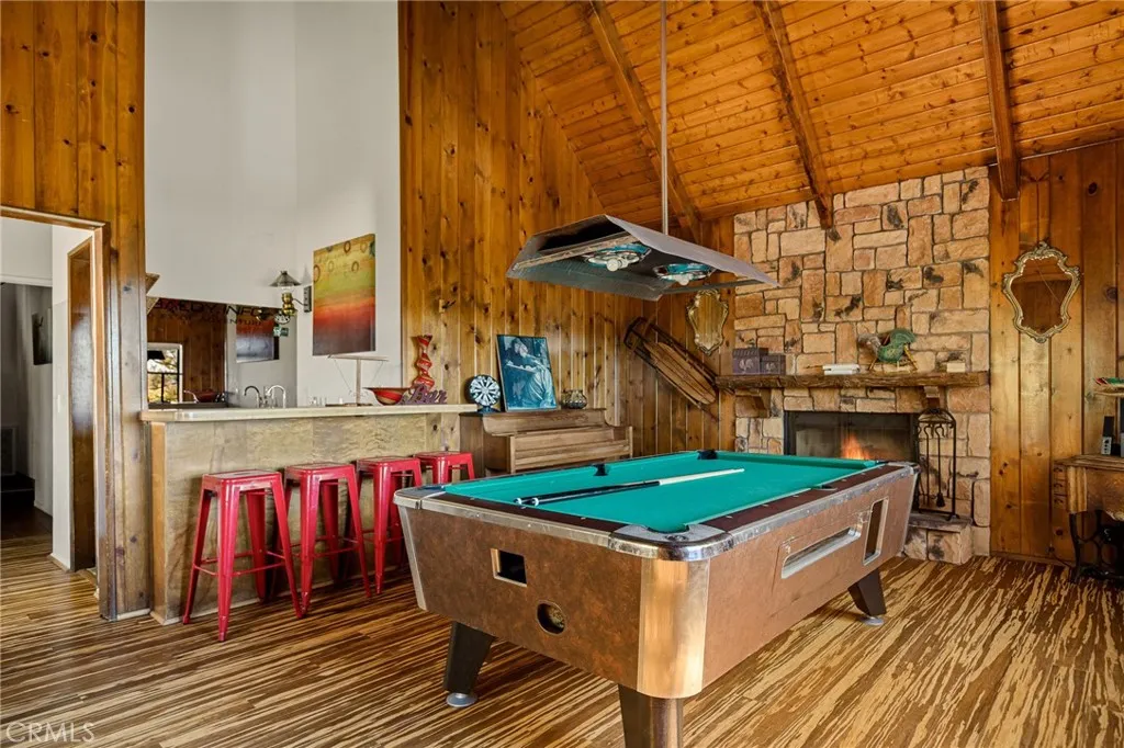 Remodeled Lake Arrowhead home with lake rights and a two-car garage. Lake and mountain views appear from multiple rooms, and the usable backyard extends the living space outdoors. Inside, the main level brings everyone together: an updated, open kitchen with solid-surface counters, refreshed lighting, and generous cabinetry flows to the dining area, where sliders open to a covered patio for year-round use. The living room centers on a classic brick fireplace, complemented by a bay-window bench that frames the view. The versatile layout offers four bedrooms plus a loft and an adjoining bonus room currently used as a fifth bedroom. The primary suite stands out with vaulted ceilings, a floor-to-ceiling stone fireplace, a spacious walk-in closet, and lake views. On the lower level, a large recreation room features wood-beamed ceilings, space for a pool table, a wet bar, and another fireplacewell-suited for gatherings or game nights. Outdoors, a terraced, low-maintenance yard pairs with a covered patio for easy indoor-outdoor flow. Located in Arrowhead Woods with lake rights, the property sits near trails, the Village, and marina amenities. Move-in ready and thoughtfully updated, it blends mountain character with modern conveniences.