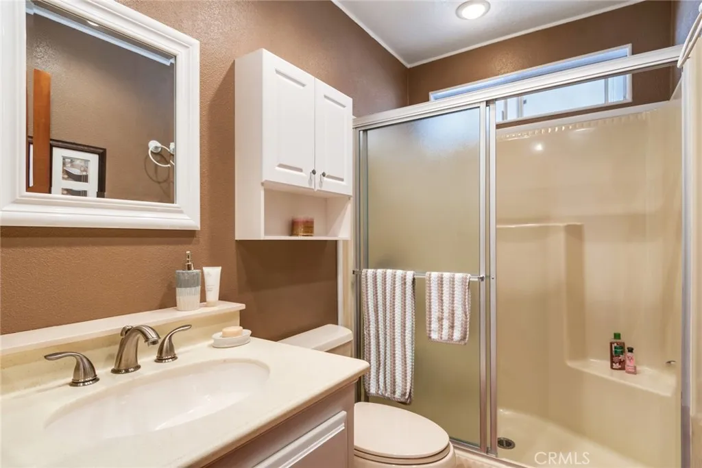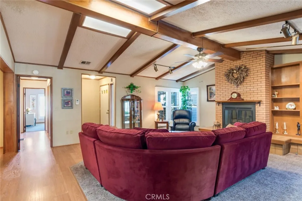 Located in the Beautiful Highland Springs Village a 55+ Community where you own your lot. Thistriple wide home shows pride of ownership and many updated features. The exterior is freshly painted, nicely landscaped, vinyl fencing and a newer composition roof. The Interior boasts laminateflooring with carpet, open beam ceiling and fireplace in the living room, plantation shutters, newer A/C unit, stainless steel appliances, Coriancountertops, updated fixtures and more. The layout is very open with the impressive large living room anchoring the center of the home. The raised hearth, gas fireplace makes this area comfortable for gatherings. Libraryor music room is off of the livingroom. The kitchenis light and cheery, enjoying some pull-out cabinet shelving, counter space, a big stainless steel sink, a double door refrigerator and an eating area. The dining room is separate but open to the grand living area. The den has two closets so could be an additional bedroom. The primary suite is spacious and separate from the guest area. A spa style bath is enjoyed from this room with: a jetted tub, a separate shower, dual sinks, a vanity, upper mirrored cabinets and all in neutral colors. A huge walk-in closet with built-ins is a real bonus. The guest room has natural light that lifts the heart. The sun room has heat/cooler and a closet, this is an additional approximate 280sf, for a total of 2490 sf. This is a large room, great for a gym, hobby room, or a game room. Storage is abundant in this home with extra closets, built-in cabinets and shelving. The laundry room has a full wall of