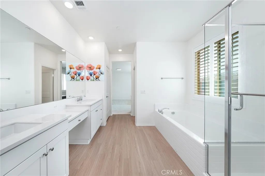 Built in 2021 by Lennar, this beautifully upgraded home is located in the desirable Park Lane community, just minutes from Costco, shopping, dining, and with easy access to Highways 60 & 15. Featuring an open-concept layout, the home is bright and functional with a stylish fireplace in the main living area. The upgraded kitchen offers white cabinetry, cooktop, upgraded range hood, double ovens, and a built-in water filtration system. A whole-house water softener system adds everyday comfort. The first-floor bedroom and full bathroom provide ideal flexibility for guests or multi-generational living. Upstairs includes a spacious loft and a primary suite with a walk-in closet. Additional highlights include solar panels for energy efficiency, a protective mesh safety screen, and fully finished front and backyard landscaping designed for easy maintenance. Move-in ready, low maintenance, and very competitively pricedan excellent opportunity in a sought-after neighborhood.