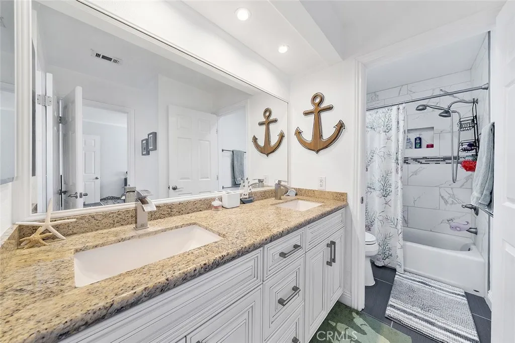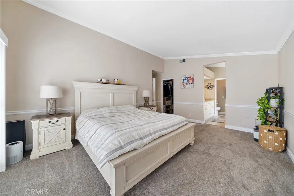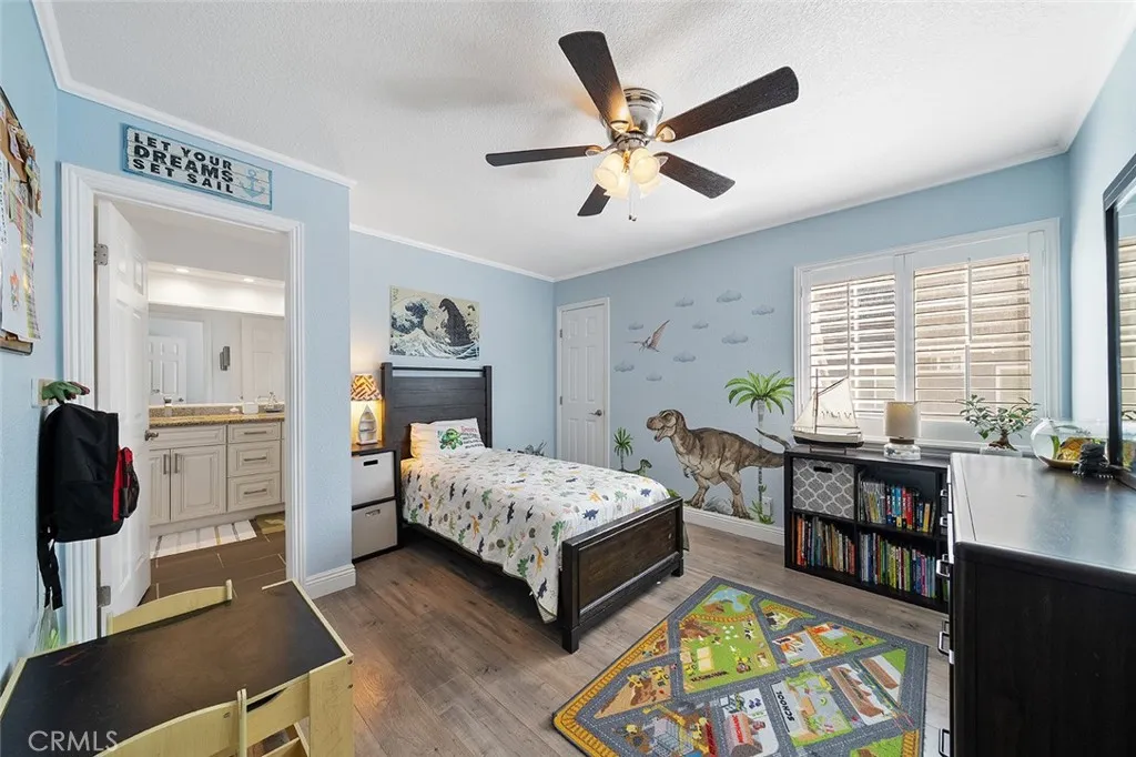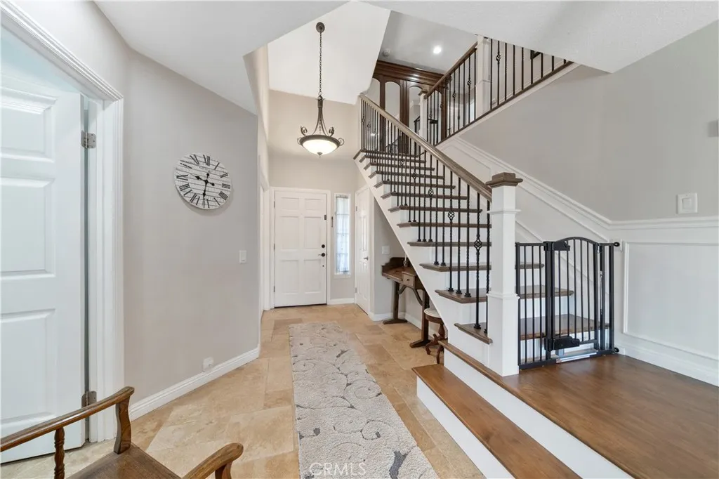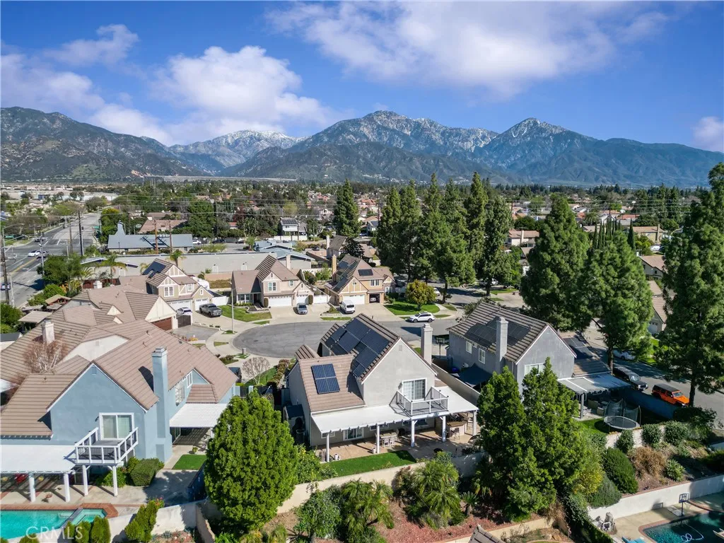Charming Storybook Home in the Upland Foothills set in a Quiet Cul-de-Sac Location. Beautifully maintained and thoughtfully upgraded, this stunning home sits on an expansive 9,000+ sq ft lot in a desirable Upland foothill neighborhood. Exceptional curb appeal and lush landscaping welcome you into a bright, open floor plan with cathedral ceilings, freshly painted interiors, and abundant natural light. The main level features a downstairs bedroom and full bathroom, a spacious living room with exposed ceiling beam, formal dining room, and dry bar. The remodeled kitchen offers granite countertops, under-cabinet lighting, self-closing cabinets, a large pantry with pull-out drawers, and an extended island ideal for dining and entertaining. Built-in cabinetry with wine refrigerator complements the adjacent family room with brick fireplace and plantation shutters. A new custom wood staircase with decorative paneling leads upstairs to four spacious bedrooms, including one with a large attached closet/playroom. The fully remodeled upstairs bathrooms feature elegant tile flooring and granite countertops, including a Jack-and-Jill bathroom. Several bedrooms include oversized closets with custom built-in shoe racks. The primary bedroom opens to a private walk-on patio with scenic views. Flooring includes travertine and plush carpet downstairs, wood flooring upstairs, and laminate flooring in select bedrooms. The outdoor space is a true retreat with meticulously landscaped front and back yards. Features include a newly redone primary bedroom balcony with Trex decking and solar lighting,