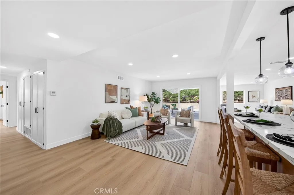 Pleased to introduce a beautifully renovated home, wholly redesigned throughout with a contemporary style, situated on a picturesque, tree-lined street in Fullerton, adjacent to a cul-de-sac within a highly sought-after neighborhood. Upon entering through the front door, you are welcomed by a bright and open interior layout that harmoniously connects each living space, creating a warm and comfortable setting for joyful family evenings. The master bedroom offers the convenience of a walk-in closet and features a wall-like glass sliding door that opens directly to the backyard, allowing you to enjoy the fresh morning air. The en-suite master bathroom is designed in a sleek, contemporary style, with a shower booth, tile flooring, and vanity that blend together seamlessly. The chefs kitchen is designed for both beauty and functionalitycomplete with custom cabinetry, quartz countertops, premium stainless steel appliances-perfect for entertaining and everyday living, and a large island which stages the room's design by adding style and functionality to the most popular spot in the house. The spacious backyard is ideal for relaxing, gardening, and entertaining. Additional highlights include an attached 2 car garage, long driveway for extra parking. Just minutes from Amerige Heights Town Center, offering shopping, dining, and recreation.