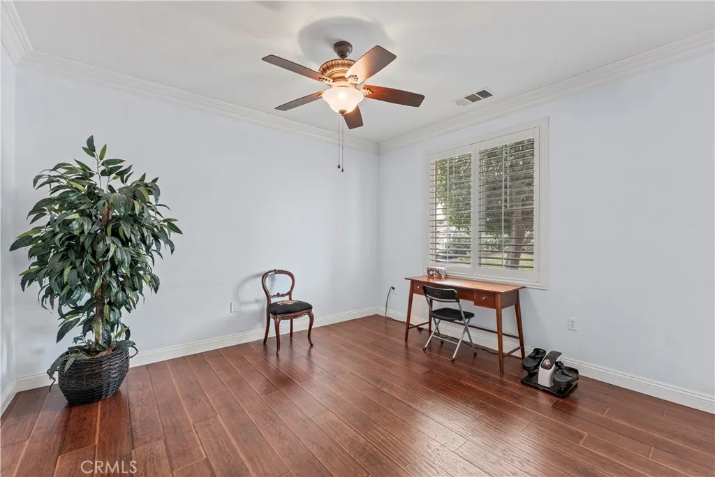 Discover a meticulously maintained home on a desirable corner lot in Hemets premier Four Seasons Over 55 community. This spacious, single-story residence offers comfort, low maintenance, and vibrant social opportunities all in one. With 2 bedrooms, 2 baths, a separate dining area, and a versatile office/den, its perfectly suited for effortless, lock-and-leave living. HIGHLIGHTS - Prime corner lot with great curb appeal and easy-access side yard - Open great room with built-in entertainment center, slider to the side yard, and direct door to the backyard - Elegant finishes throughout: wood floors, plantation shutters, crown molding, and ceiling fans in every room - Kitchen features wood cabinetry, granite countertops, pull-out drawers, and a pantry - Primary suite and guest bedroom/guest bath for comfort and privacy - Garage with epoxy flooring and abundant storage cabinets and shelves - Private outdoor retreat: low-maintenance yard, Alumawood patio cover, tranquil fountain, and a natural gas fireplace - Automated sprinkler/drip system keeps landscaping vibrant with minimal effort COMMUNITY AND LIFESTYLE - 24-hour security and a true resort-style atmosphere - Extensive amenities: Bistro, ballroom, theatre, game room, billiards, library, gym, salon, covered BBQ area, pool, spa, bocce, shuffleboard, tennis, and pickleball - Nearby attractions: casinos, Diamond Valley Lake, Temecula Wine Country - Convenient access to Palm Springs (40 miles), San Diego (65 miles), and Los Angeles (80 miles) This home is perfect for snowbirds, downsizers, or anyone seeking a vibrant, active 55+