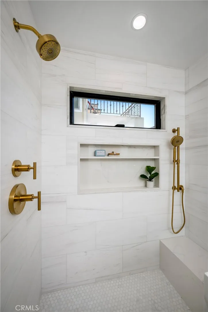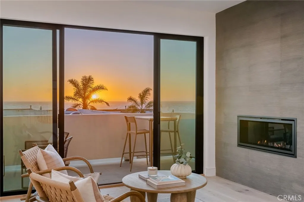 Situated just one block above the white sand beaches of Manhattan Beach and the Pacific Ocean, this stunning 95% new construction custom townhome offers 2,143 square feet of thoughtfully reimagined living space with 3 bedrooms and 3.5 baths. Extensively rebuilt with all new windows, doors, cutom cabinets. plumbing, electrical, fire sprinkler system, mechanical systems, heater, and A/C, the home blends modern engineering with refined coastal design. The top floor was structurally redesigned by an engineer, incorporating steel beams to create a dramatic, fully open great room. This expansive space showcases panoramic, unblockable ocean, Palos Verdes, Catalina Island, and sunset views from both the interior and the 24 x 7 deck, finished with custom exterior porcelain tile for seamless indoor-outdoor living. The gourmet kitchen features Thermador appliances, Dolamite quartz countertops and peninsula with bar seating, and designer lighting fixtures throughout. A fireplace anchors the living area, while custom modern glass railings enhance the clean architectural lines and preserve the views. Wide-plank 9 white oak flooring runs throughout, complemented by curated designer tile selections in each bathroom. The standing seam metal roof and custom modern sectional wood garage door add distinctive architectural character and durability. The homes location on Bayview is especially unique. Positioned on the apex of a convex-shaped block between First Street and Homer, this property enjoys exceptional natural light, enhanced privacy, and maximized view corridors. The main entry level i
