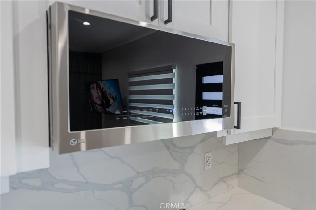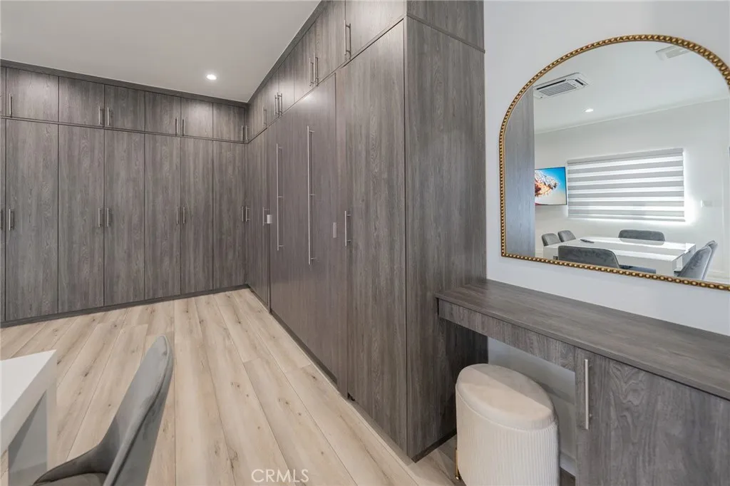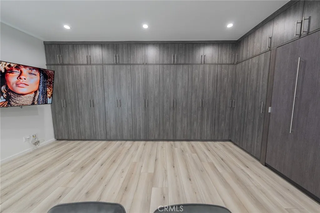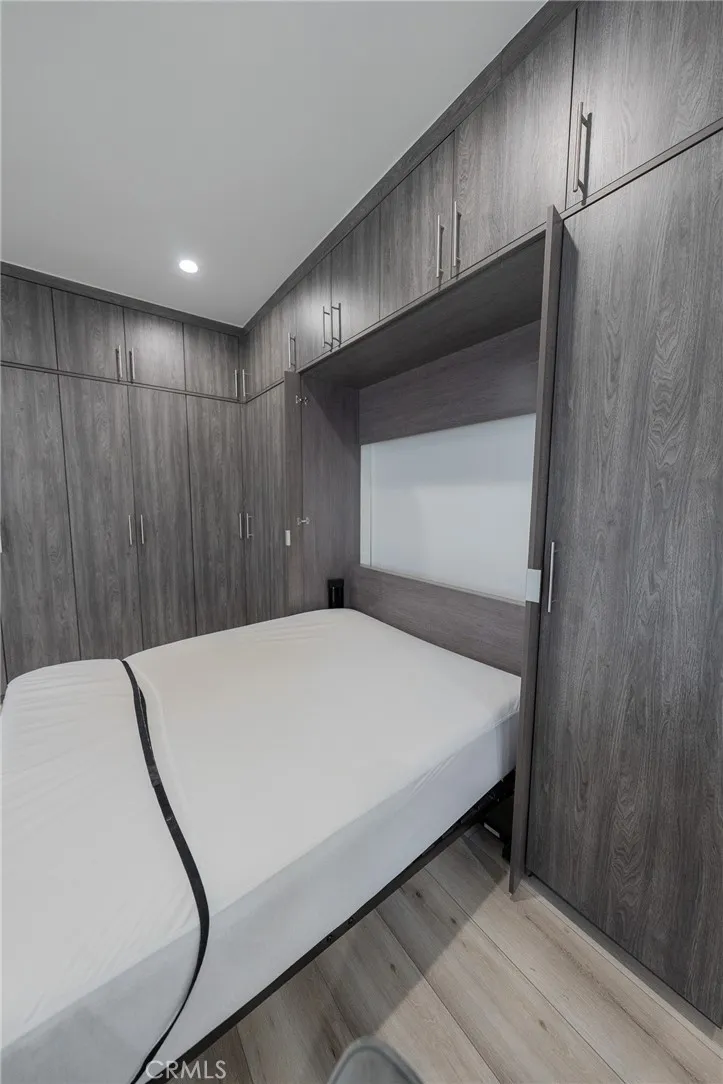 Discover modern living in this beautifully designed, studio ADU that offers a perfect blend of style and efficiency. This pristine unit features a bright, open floor plan with premium wood-style flooring, recessed lighting, and a ceiling cassette mini-split HVAC system for year-round comfort. The sleek kitchen boasts quartz-style countertops, white shaker cabinets, and stainless steel appliances, including a gas range, dishwasher, microwave, and French door refrigerator. Thoughtfully optimized for space, the living area includes extensive wall-to-wall custom wardrobe cabinetry, a concealed wall bed, a mounted flat-screen TV, and a dining table. Additional conveniences include an in-unit stacked washer and dryer and a contemporary bathroom with a fully tiled walk-in shower. Outside, enjoy a private entrance with a spacious, hardscaped patio area. A fantastic opportunity for turnkey, comfortable living!
