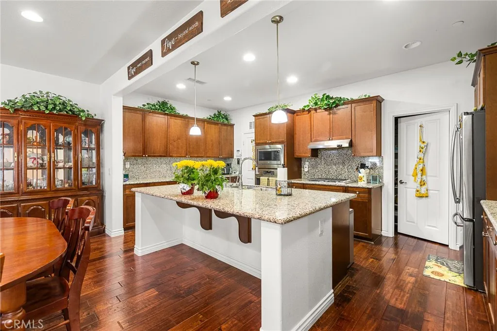Welcome to this beautifully appointed custom single-story home offering 4 bedrooms and 3.5 bathrooms on a spacious 1/3-acre lot in a well Established neighborhood of Redlands. Designed with both comfort and style in mind, this residence showcases tasteful modern finishes and warm neutral tones throughout. Step inside to find rich hardwood flooring, plantation shutters on every window, a whole-home water softener system, and an energy-efficient 24-panel PAID solar system. The open-concept layout is ideal for entertaining, centered around a grand kitchen featuring abundant prep space, generous cabinetry, and a walk-in pantry. The thoughtfully designed split-bedroom floor plan offers privacy and flexibility for family living, while an additional family room/flex space on the north end of the home provides the perfect area for a media room, office, or playroom. Outdoors, unwind in the serene backyard oasis complete with an alumawood patio cover, stamped concrete, Vinyl fencing with custom iron gates and a charming river-rock stream feature spanning the length of the yard. Both side yards are fully irrigated and home to thriving fruit groves including avocado, apple, grapefruit, tangerine, plum, guava, dragon fruit, Chinese apple, blood orange, cherimoya, and longan all producing. Additional highlights include a 3-car garage, convenient indoor laundry room and water softener system. Modern comfort, energy efficiency, and resort-style outdoor living all on one level with No HOA or Mello Roos! Don't Miss this one!