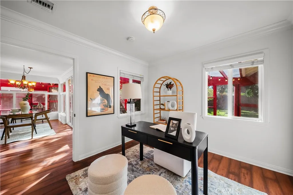 Imagine a home where luxury living and feline paradise exist in perfect harmony! Welcome to one of Northridges most unique and extraordinary properties, featuring 3 bedrooms, 2 bathrooms, and a fully permitted 733 sq. ft. custom Catio designed by world renowned cat behaviorist Jackson Galaxy of the TV show My Cat From Hell and designer Kate Benjamin. The expansive, fully enclosed Catio allows your cats to climb, lounge, explore, and safely enjoy the outdoors, creating an unparalleled indoor/outdoor lifestyle for both you and your beloved companions. Inside, the home is equally inviting! The stylish interior is light, bright, and freshly painted throughout, featuring beautiful wood and tile flooring, a cozy fireplace, and a state of the art security system. The primary bedroom offers an en suite bathroom, a relaxing sitting area, and direct sliding door access to the Catio, creating a seamless retreat for both you and your feline family. The thoughtfully designed layout provides comfortable living spaces ideal for everyday living and entertaining. Step beyond the Catio and discover a lush backyard retreat designed for unforgettable gatherings. Enjoy a newer spa, multiple seating areas, mature soaring trees, and a flexible structure offering endless possibilities for storage, hobbies, or creative space. The garage adds another layer of convenience with custom cabinetry, epoxy flooring, a large utility sink, and an included washer and dryer. Set back from the street with an oversized driveway, the property offers a sense of privacy while providing ample parking. Ideally locate