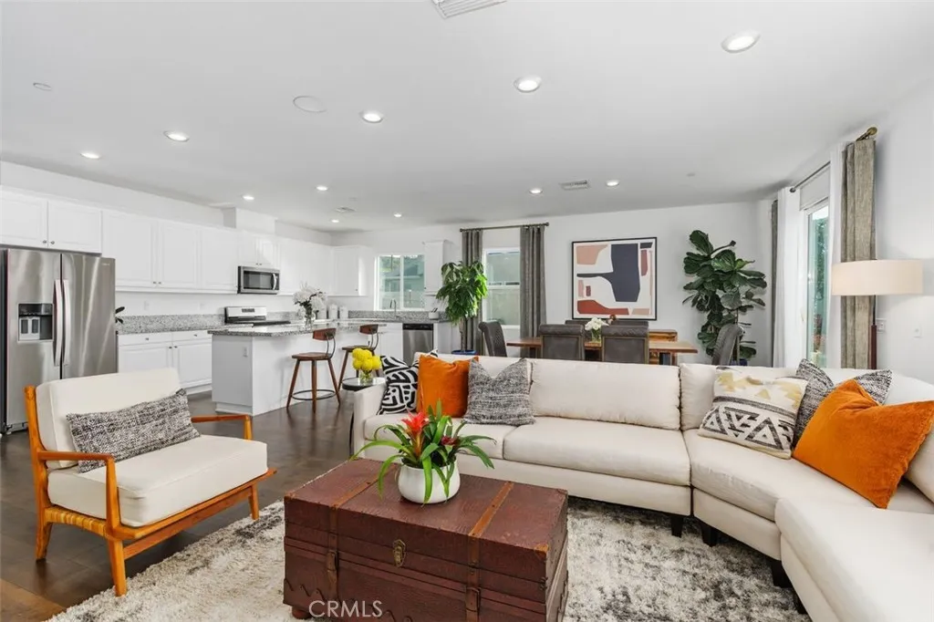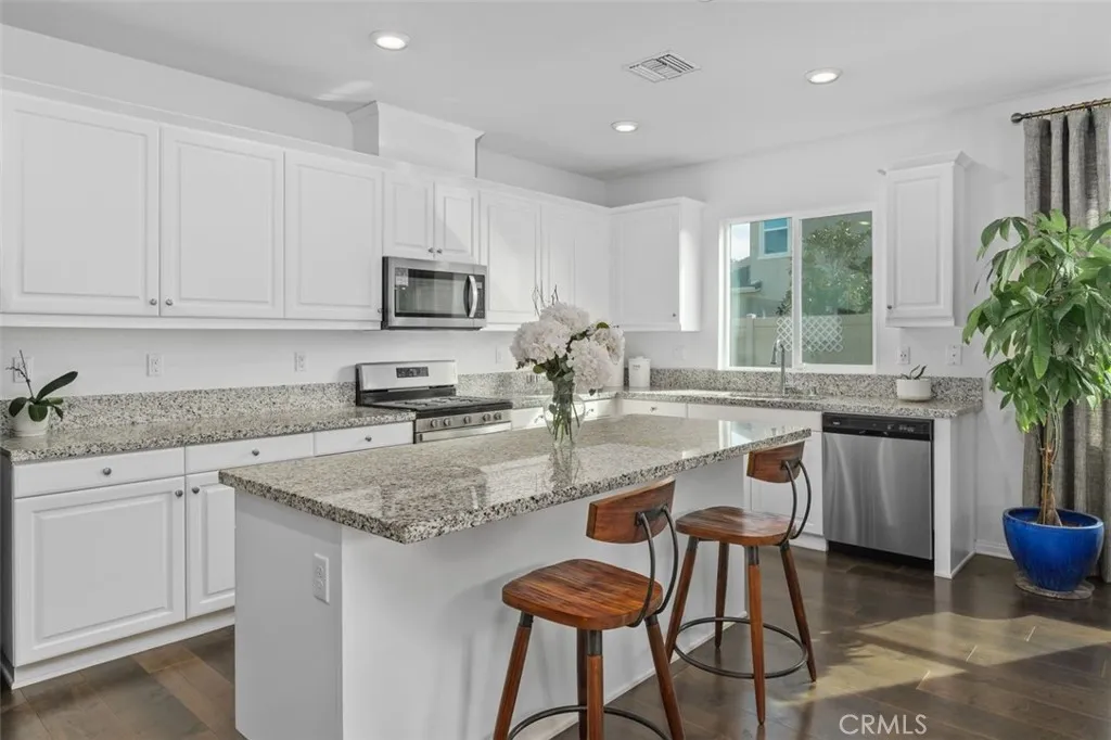 Experience elevated single story living in this former model home featuring open concept design, refined wood flooring, and abundant natural light throughout. A private office offers flexibility for work or leisure. The gourmet kitchen includes white soft close cabinetry, granite countertops, a large island with seating for six, and Energy Star Whirlpool stainless steel appliances. It opens to the great room and dining area for seamless everyday living and entertaining. Expansive sliding doors highlight serene mountain views, and extend the living space to the backyard. Secondary bedrooms feature mirrored wardrobe doors and share a guest bath with an adult height dual sink vanity. The spacious primary suite offers mountain views, an ensuite with dual sinks, white tile flooring, soaking tub, oversized shower, and a custom built in closet. The low maintenance backyard is designed for relaxation and upscale entertaining that includes a large patio with pergola, premium artificial turf, in ground irrigation, and curated drought tolerant professional landscapingideal for relaxing or entertaining. Additional high-end amenities include owned solar, a two car garage with EV charging, epoxy flooring, mixed block/wrought iron/vinyl fencing, indoor laundry with Whirlpool washer and dryer, custom draperies, integrated alarm and camera system, and select artwork. This home is Energy-Efficient!