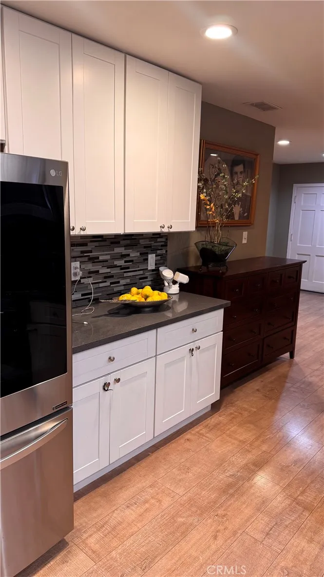 Fully Remodeled 2 Bed / 1 Bath Move-In Ready! This beautifully reimagined home showcases refined modern finishes throughout, including a designer kitchen with white shaker cabinetry, sleek quartz countertops, mosaic backsplash, stainless steel appliances, and recessed LED lighting. The spa-inspired bath features custom tilework, a quartz-topped vanity, oversized mirror, and rain shower. Upgrades include new dual-pane windows, a new roof, fresh paint, premium flooring, and solid core doors. Enjoy whole-house audio extending to a spacious covered patio, ideal for entertaining. The property also offers a large garage with 220V subpanel, expansive RV parking, and professionally landscaped grounds with automatic sprinklersan exceptional, turnkey offering.