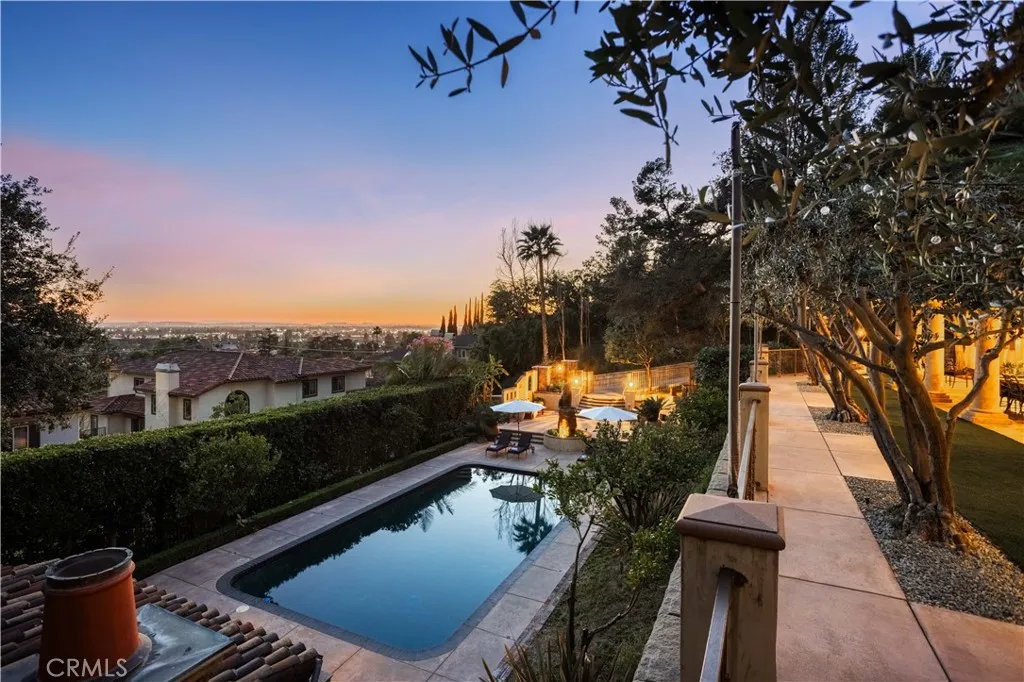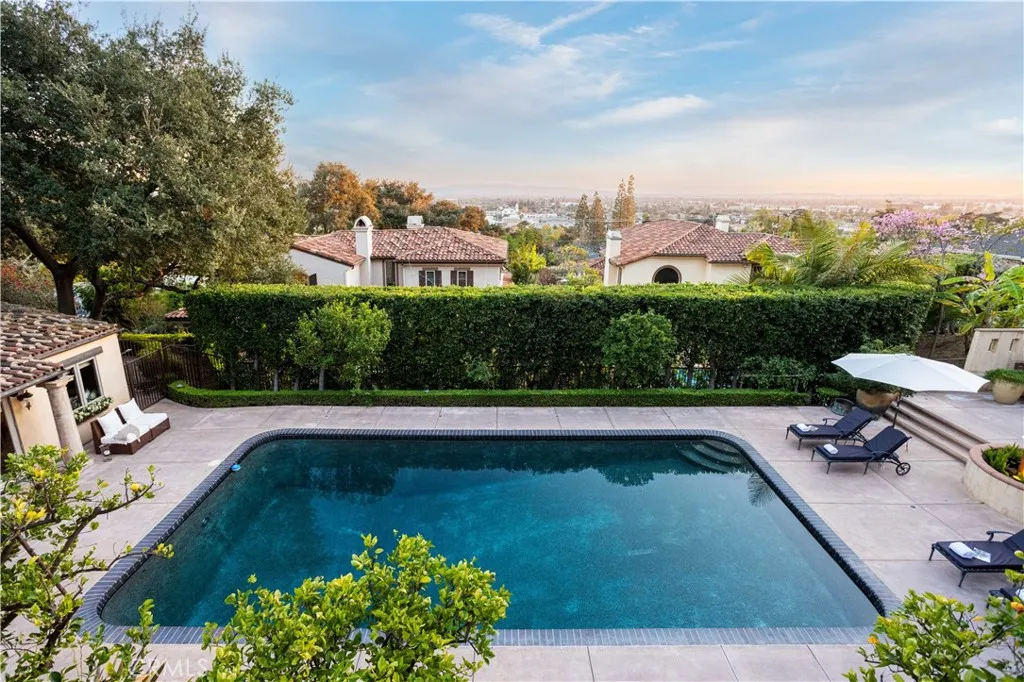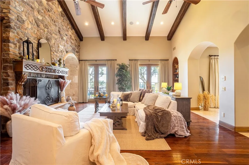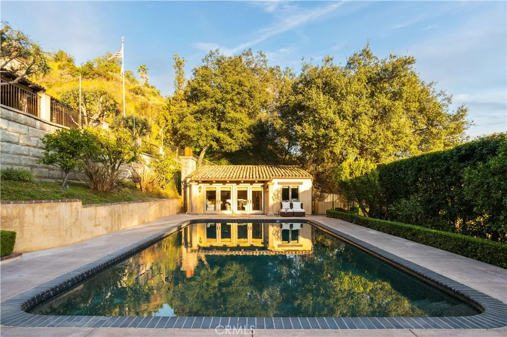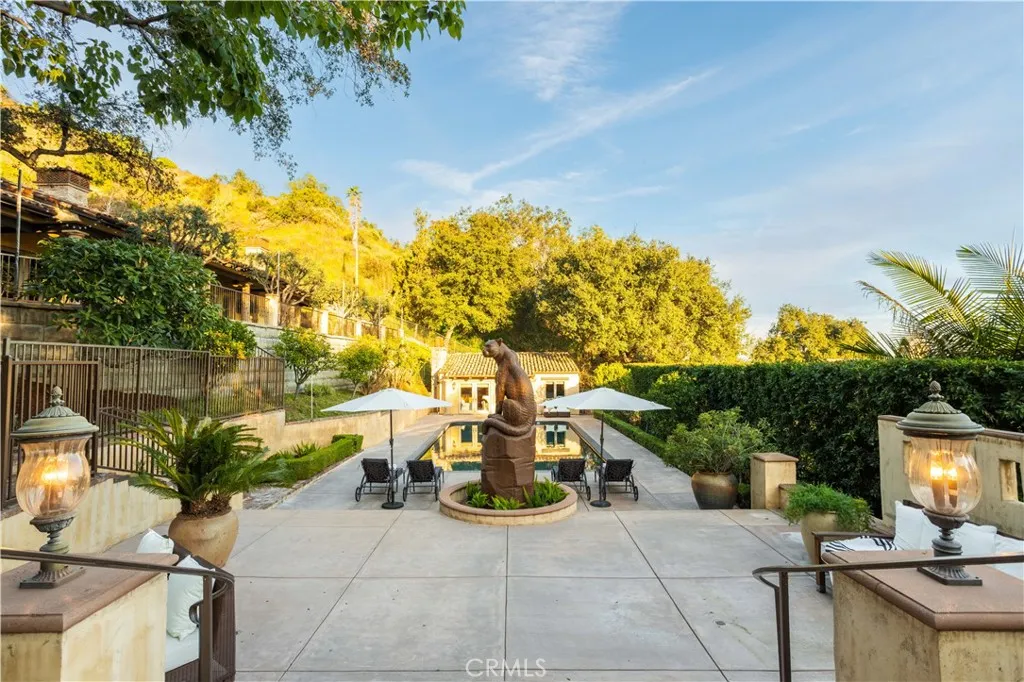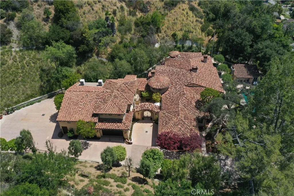 Perched majestically in the foothills of Monrovia, this one-of-a-kind Italian villa-inspired estate offers an unparalleled lifestyle defined by privacy, luxury, and sweeping city views. Sprawling across 13.12 acres, the property features a masterful 4,968 sq. ft. single-level main residence where architectural elegance meets seamless indoor-outdoor flow. The journey begins in a tranquil courtyard with a soothing fountain, leading through a grand foyer into a floorplan designed for sophisticated entertaining. The formal living room, marked by soaring vaulted ceilings and a massive stone double-sided fireplace, transitions into an expansive family room. This space is a connoisseur's dream, equipped with a full wet bar, wine cellar, wine fridge, and built-in cappuccino machine. Both rooms feature French doors opening to a vast covered patio framing breathtaking vistas. At the heart of the home lies a chefs kitchen, meticulously appointed with professional-grade appliances, double ovens, a warming drawer, and a large center island with a new cooktop. Granite countertops, custom cabinetry, and a walk-in pantry provide abundant storage, while the breakfast area and built-in desk offer everyday functionality. The kitchen flows gracefully into the formal dining room, perfect for large-scale gatherings. The primary suite is tucked privately at the rear of the home, featuring a fireplace, cedar-lined walk-in closet, and a spa-like bathroom with dual vanities, a soaking tub, and a multi-head steam shower. Three additional bedrooms, two full bathrooms, and two powder rooms ensure comfo